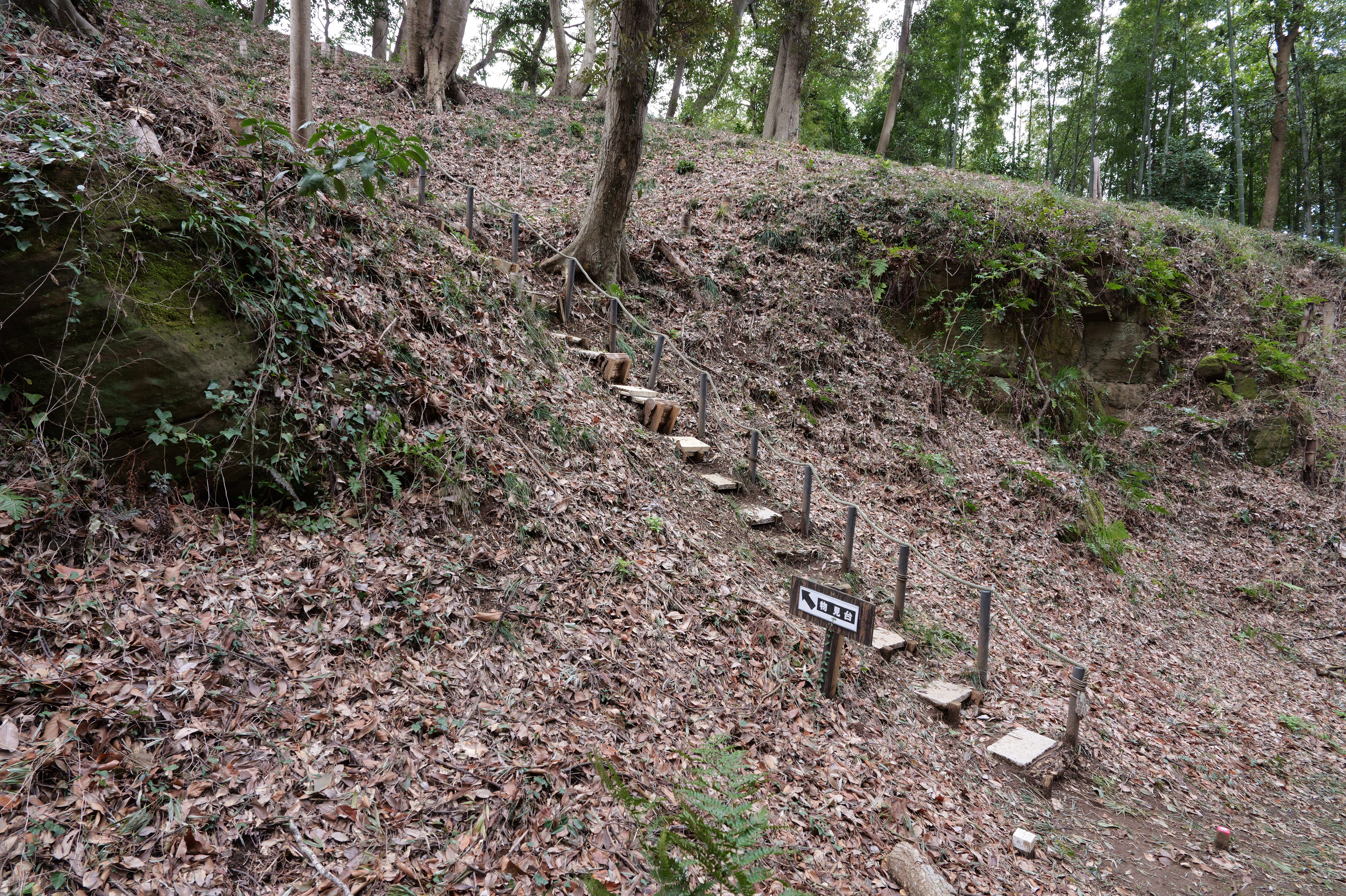 空堀を進むと途中物見台へ登る階段がありますが、そのまま進んで行くと最終的にはものすごい絶壁で行き止まりになっています。