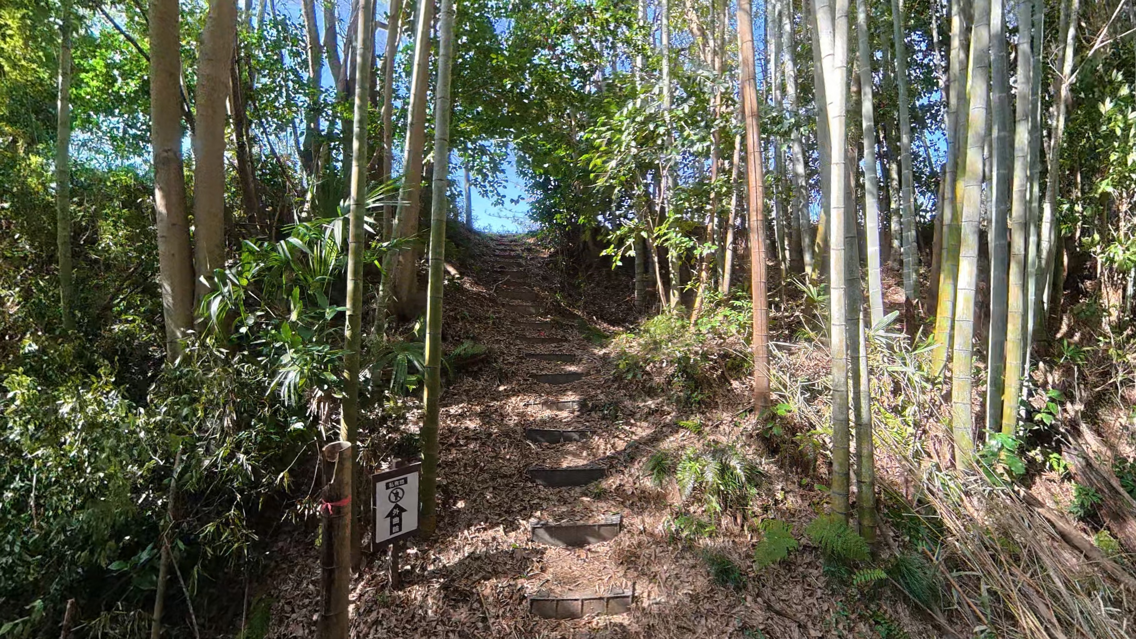 登城口の階段から進むと、進む方向を教えてくれる案内板があります。このような案内板が城跡一帯に設置されていてとても散策がしやすいです。ここまで丁寧に案内があるところは珍しいかも。案内板によると左に進んですぐにある旧階段を登ると一の曲輪、それ以外はまっすぐ進むとなっています。外側から徐々に攻めたいので、そのまままっすぐ進みます。