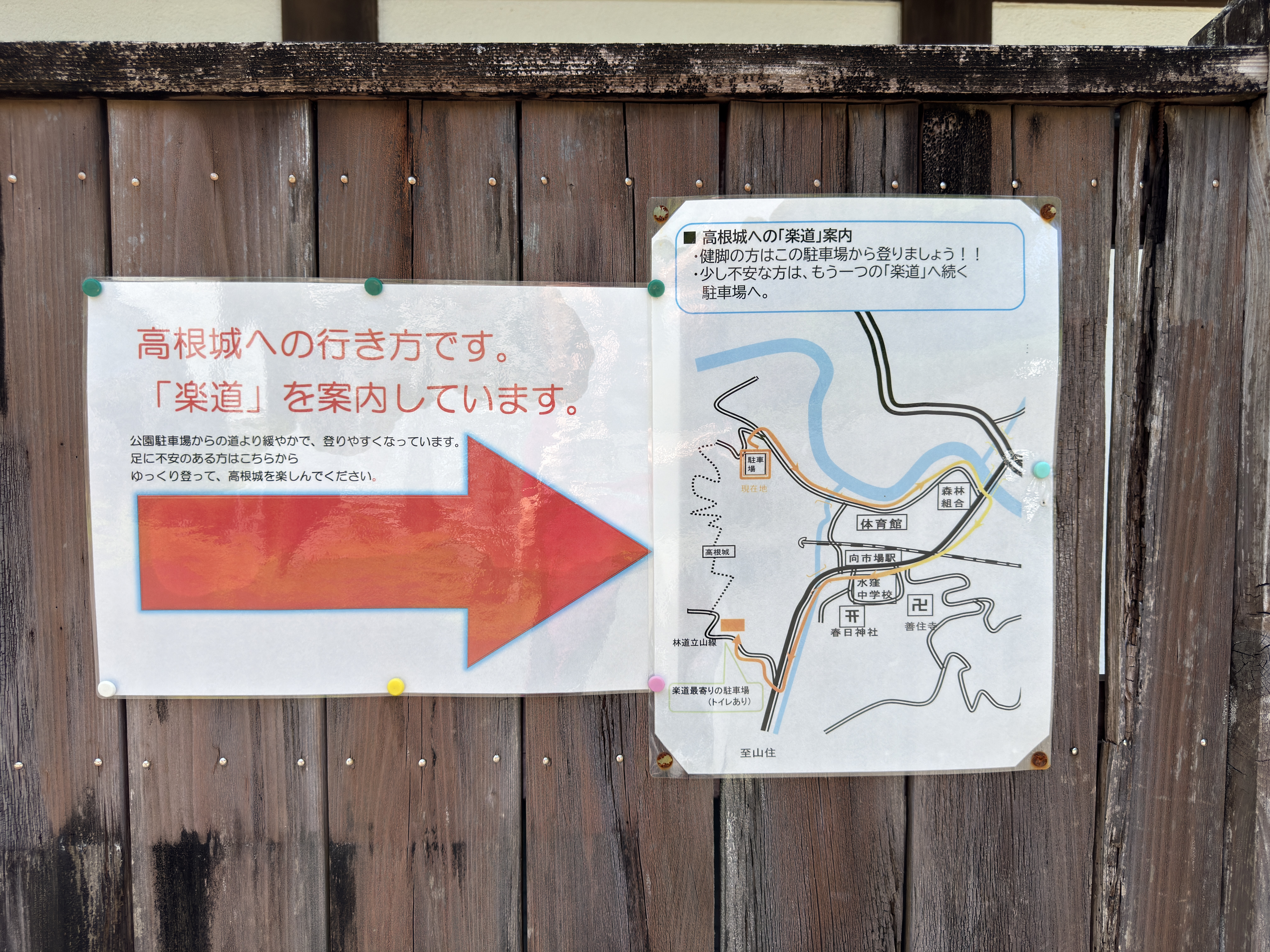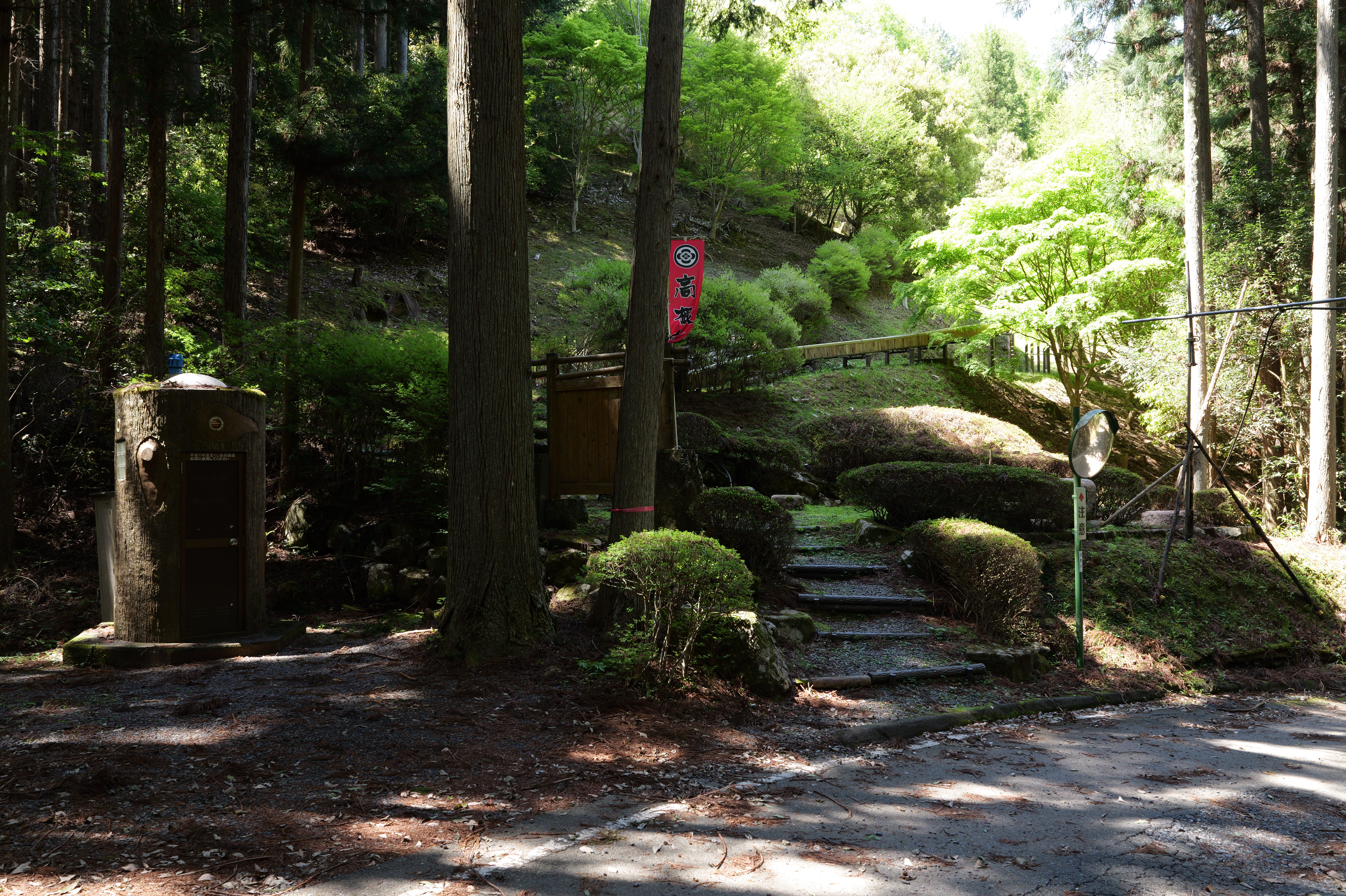 12:39ごろ高根城公園駐車場に到着、少し休憩してここから登城する予定でしたが高根城への「楽道」(林道立山線)案内が貼ってあり、そちらから登城することにしました。
