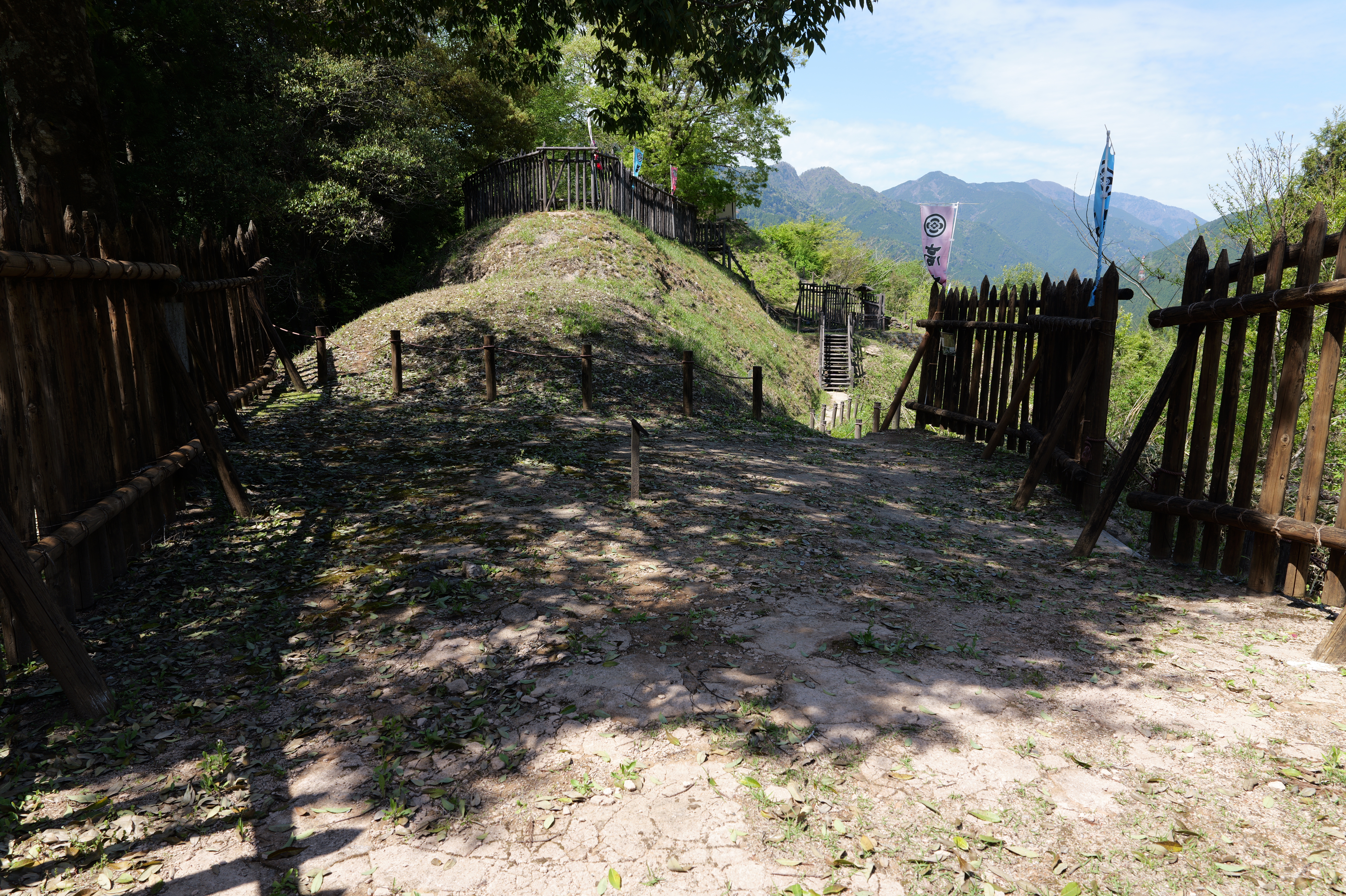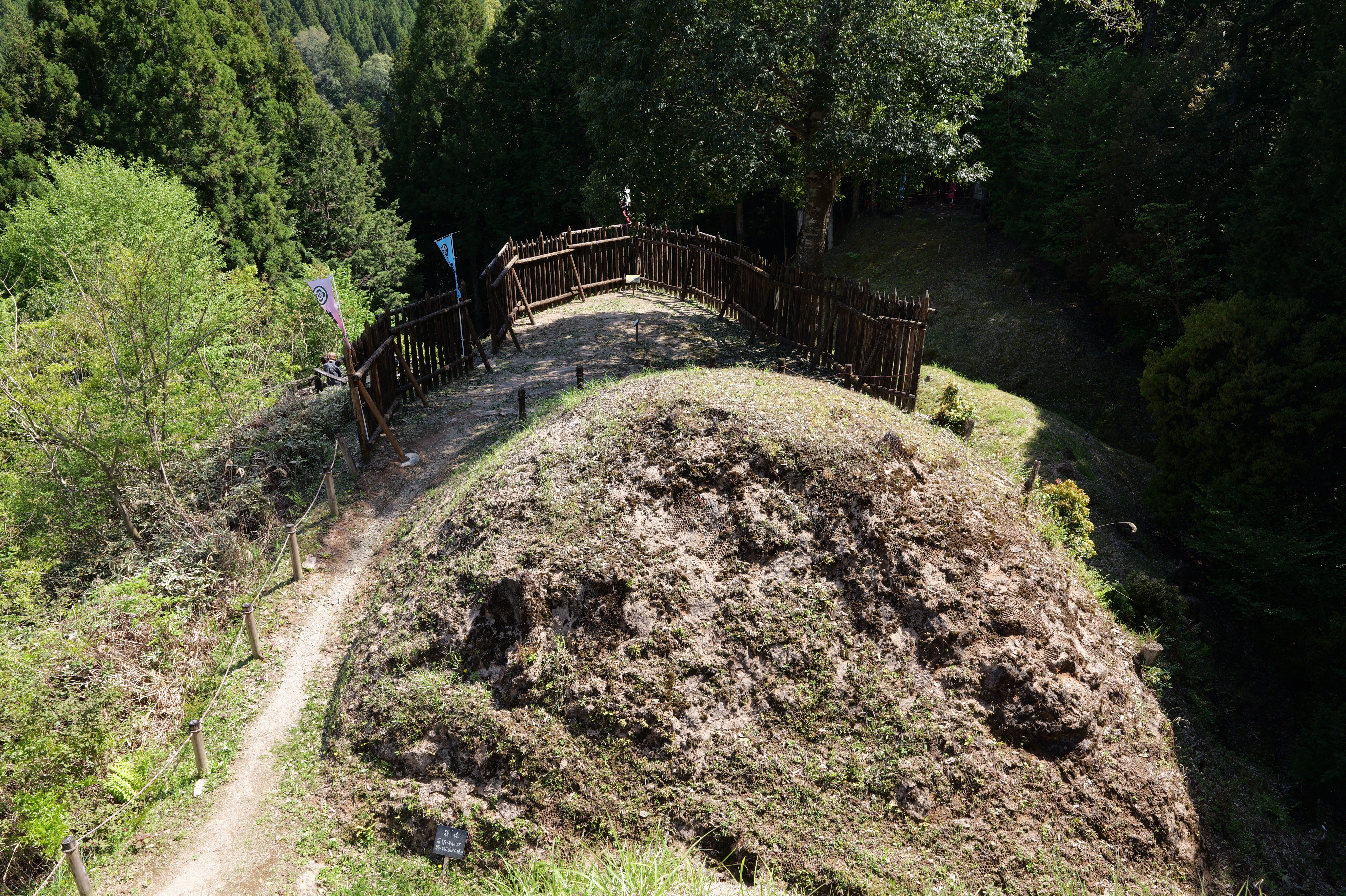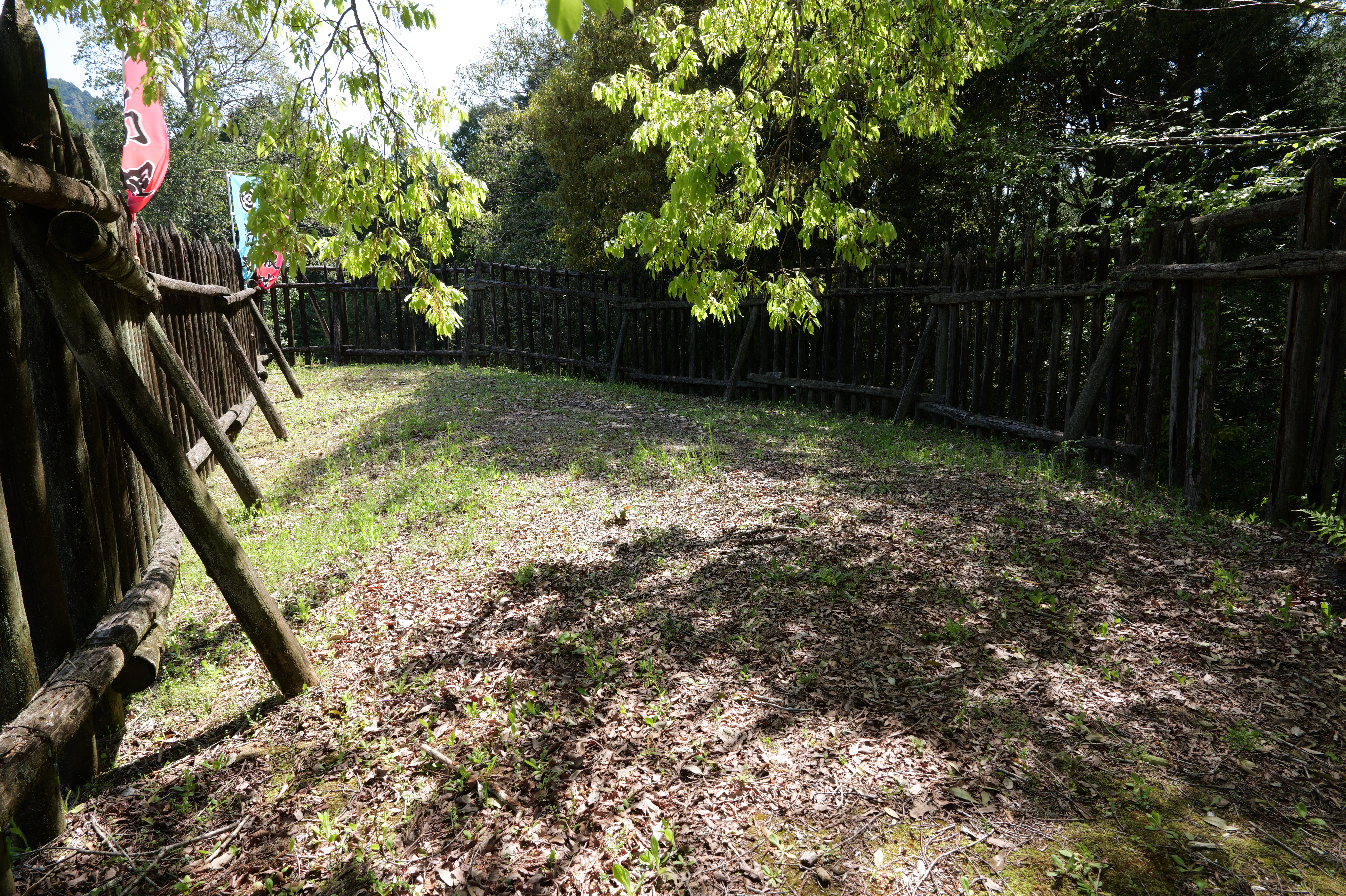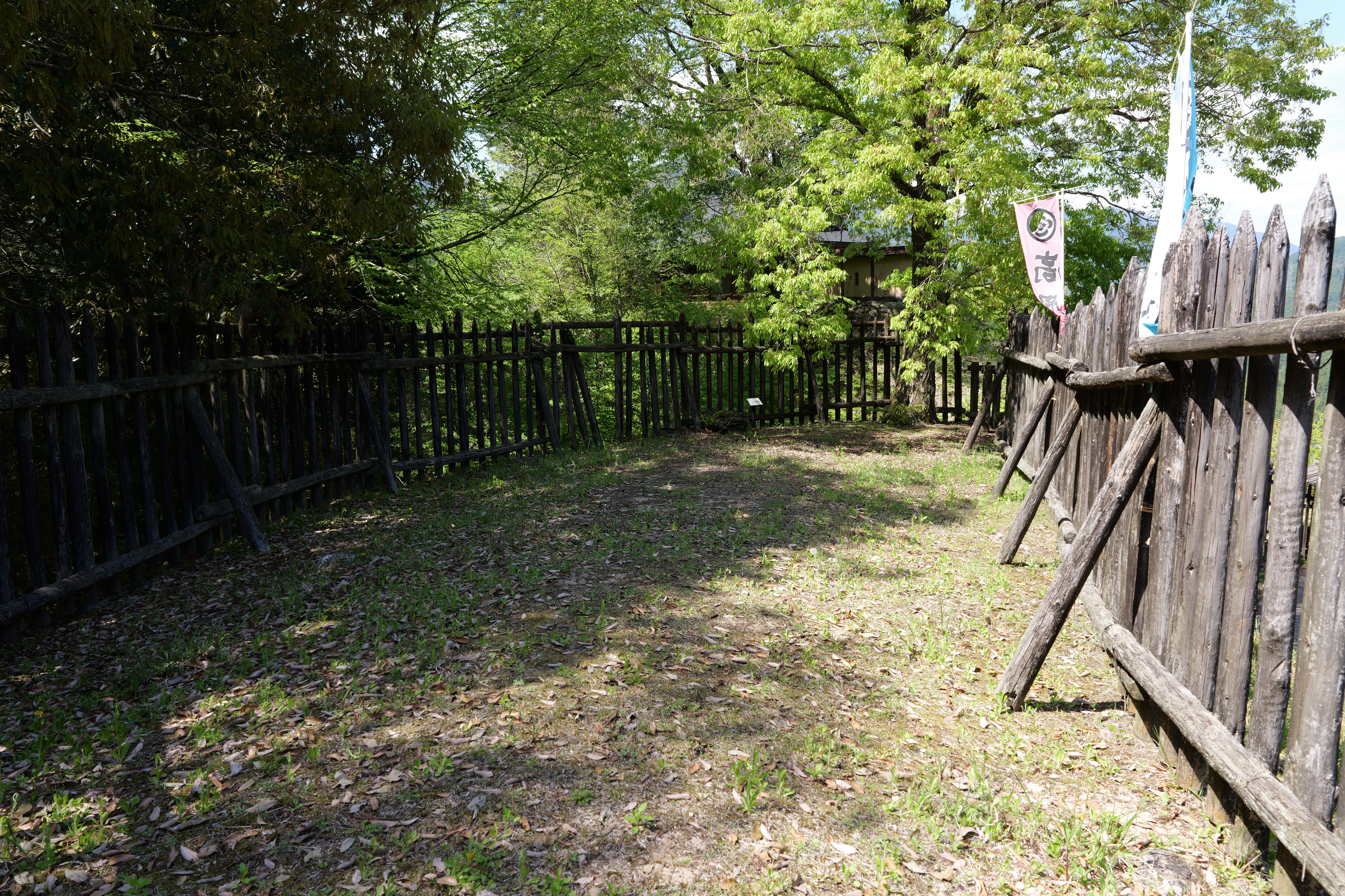 楽道最寄りの駐車場には12:54到着、確かに坂も少なく楽な道を6分ほど歩くと、三の曲輪と二重堀切を挟んだ対面、二の曲輪まで見渡せる城外の高台に出ます。復元された柵列がいかにも山の砦のような雰囲気を醸し出しています。