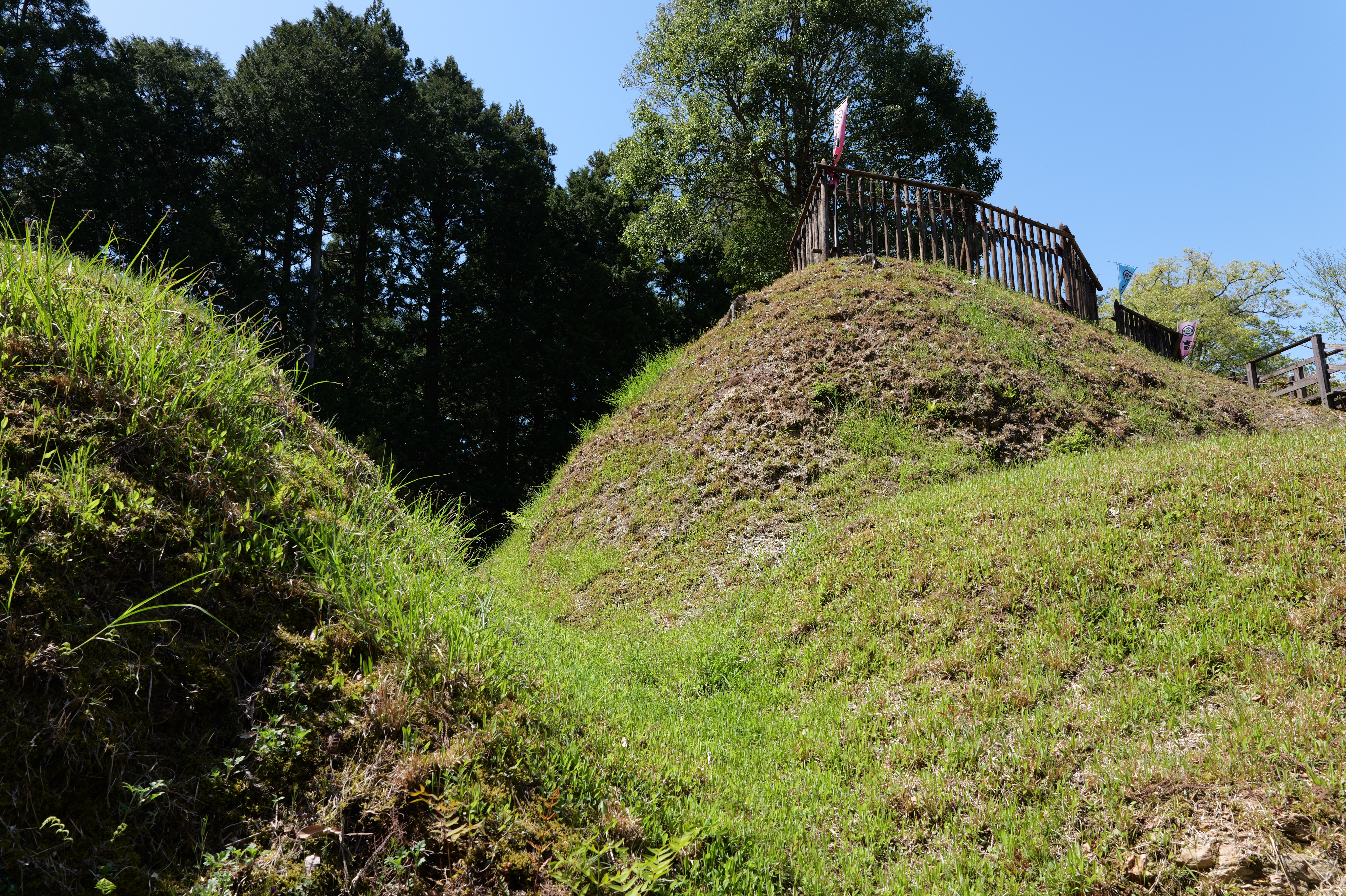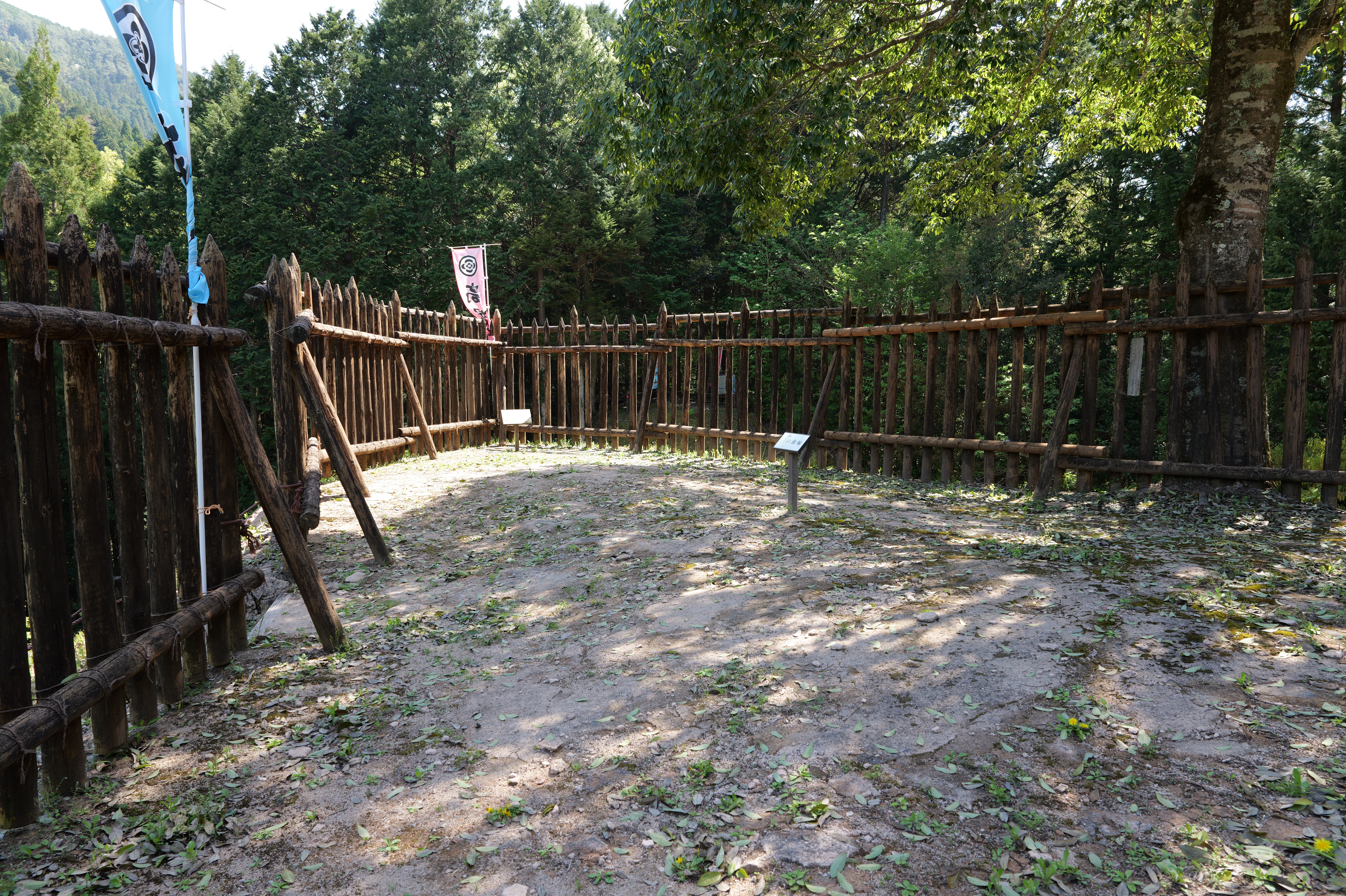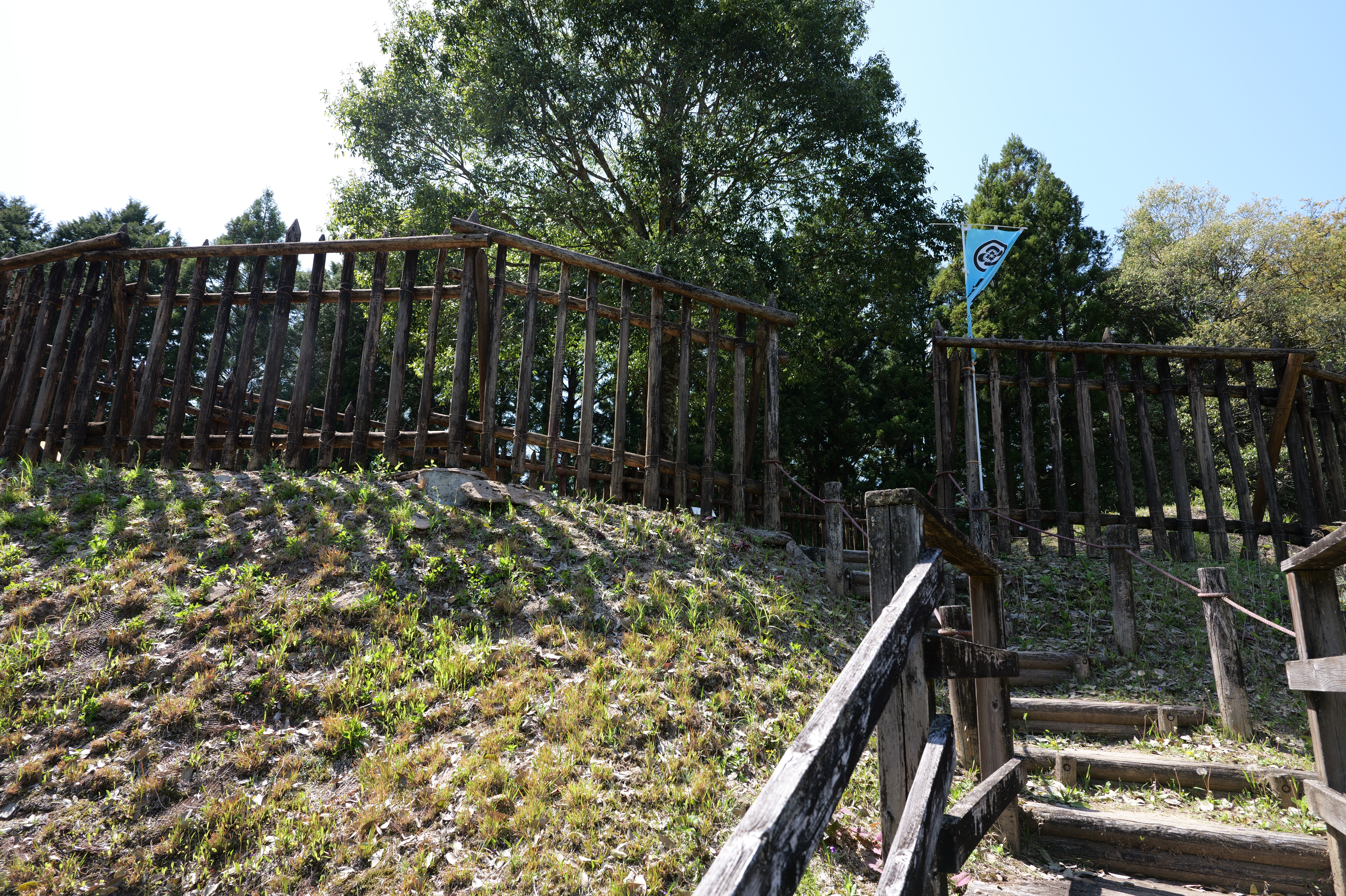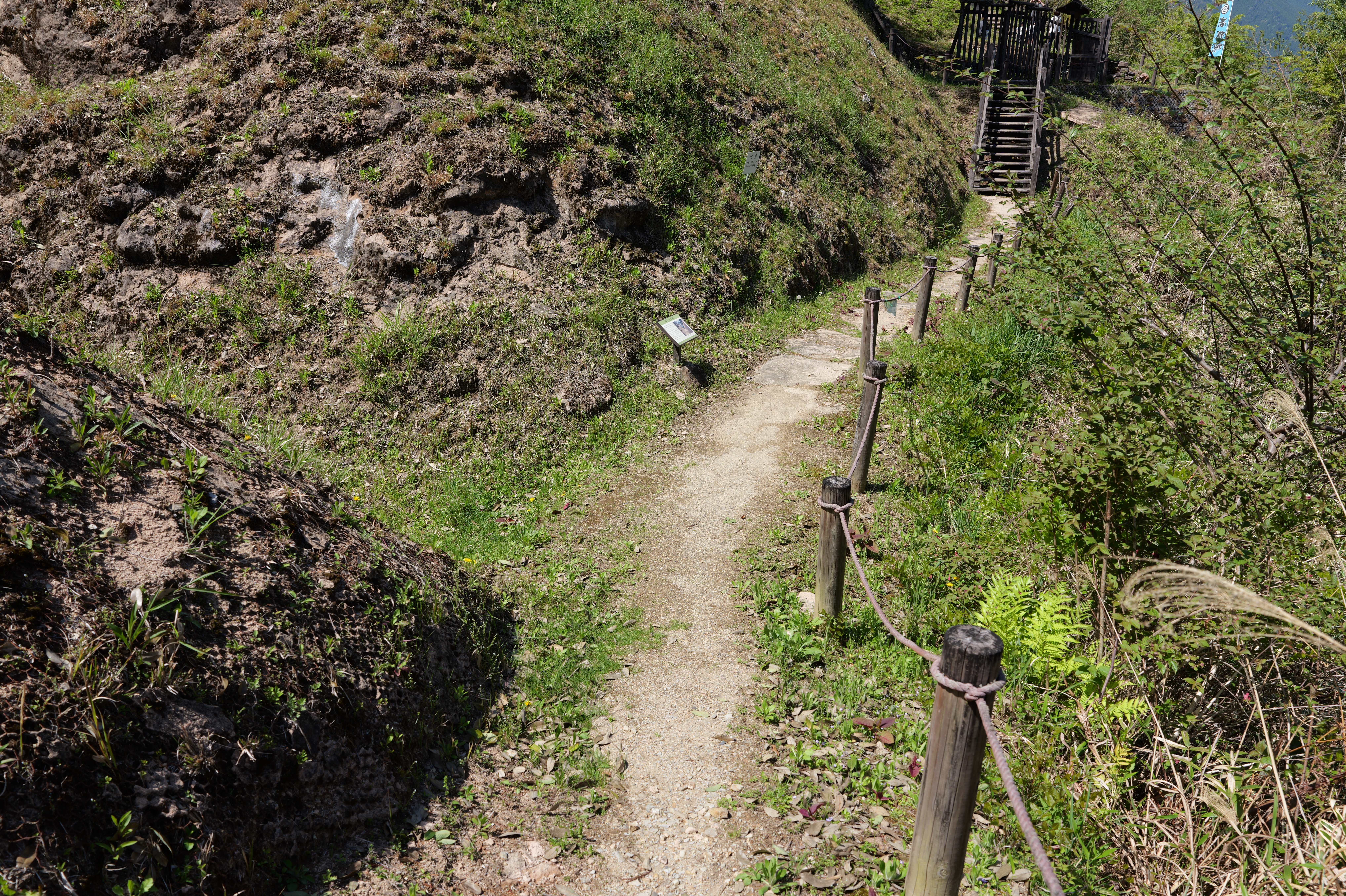 楽道最寄りの駐車場には12:54到着、確かに坂も少なく楽な道を6分ほど歩くと、三の曲輪と二重堀切を挟んだ対面、二の曲輪まで見渡せる城外の高台に出ます。復元された柵列がいかにも山の砦のような雰囲気を醸し出しています。