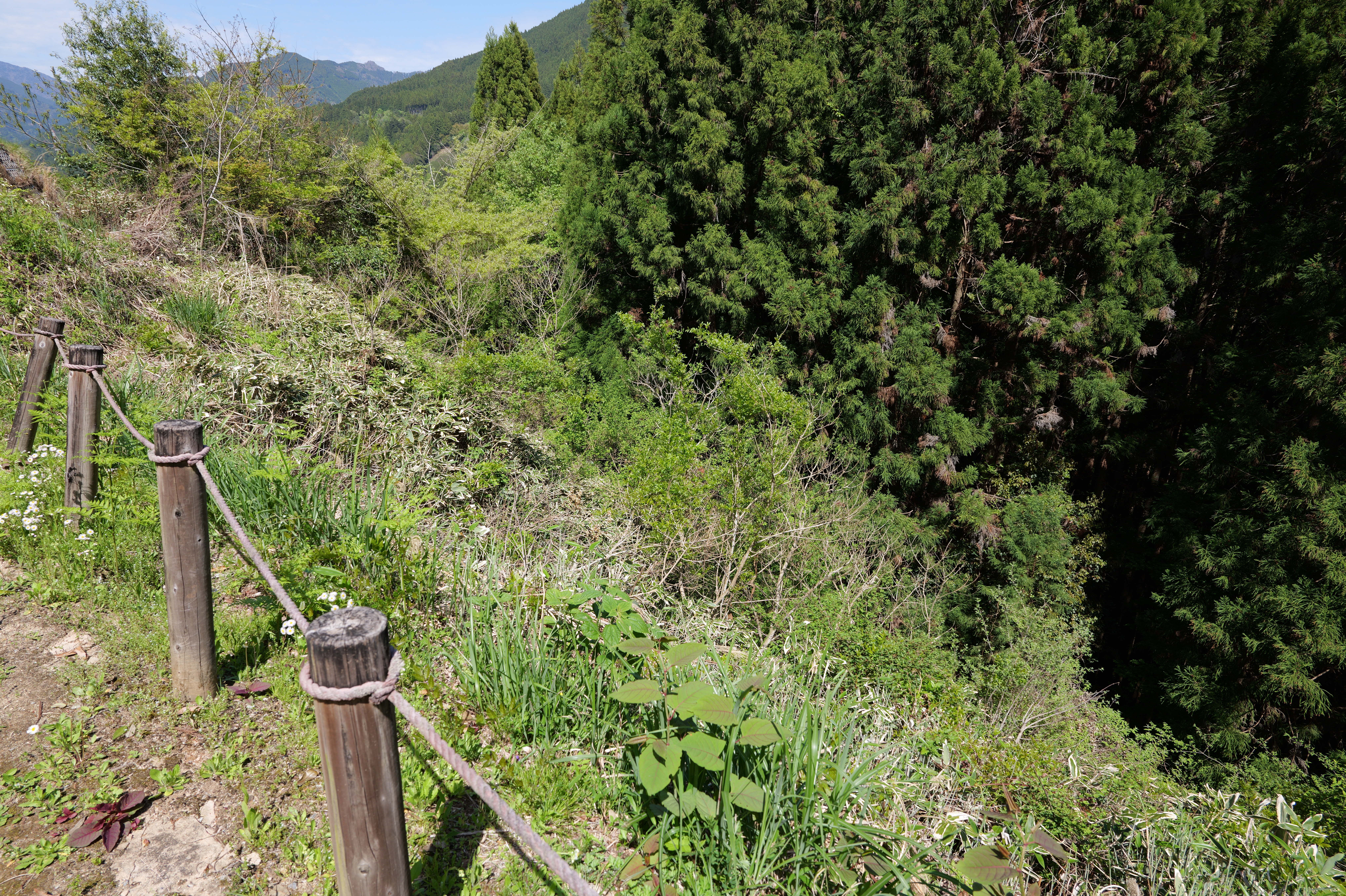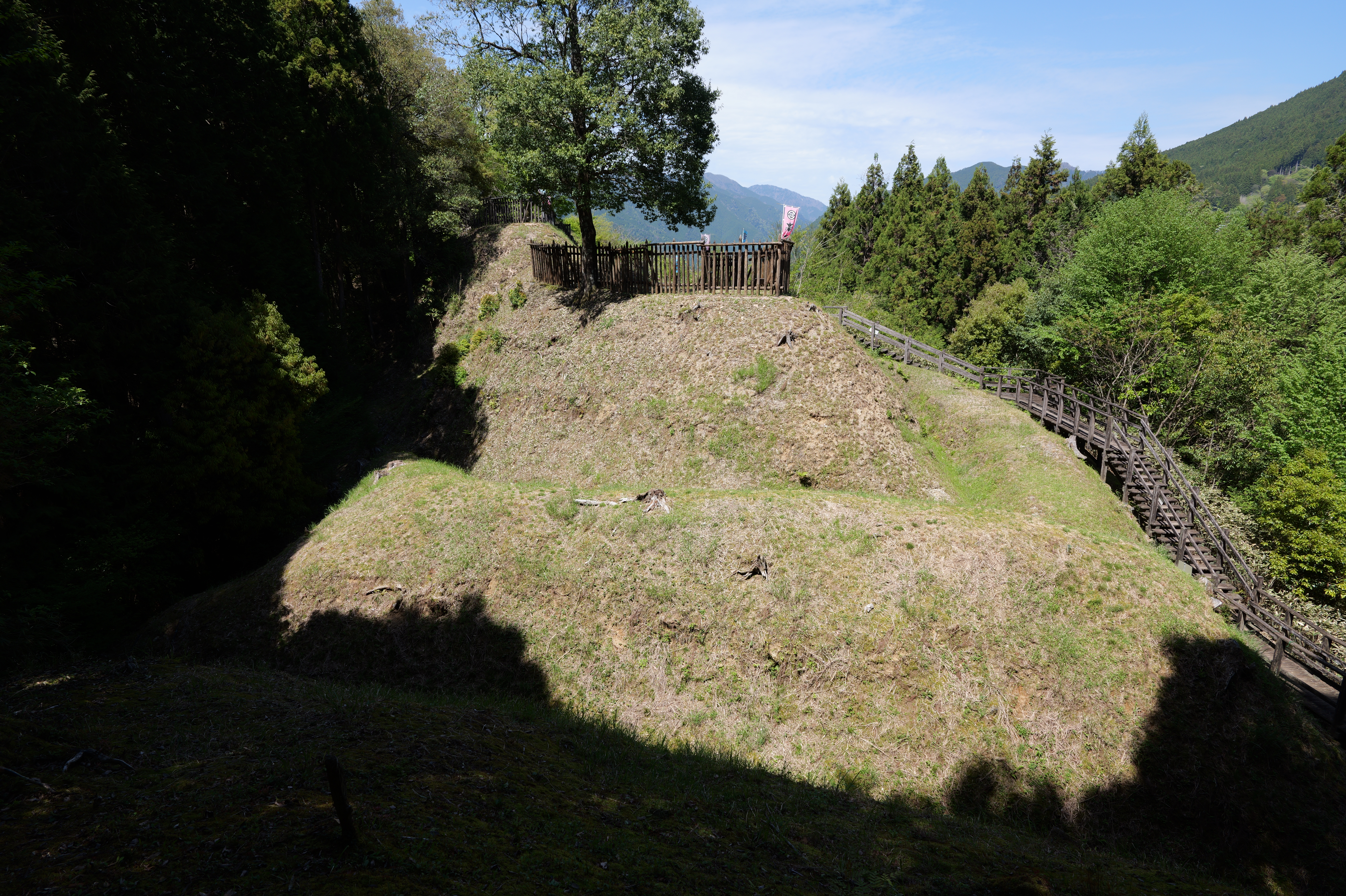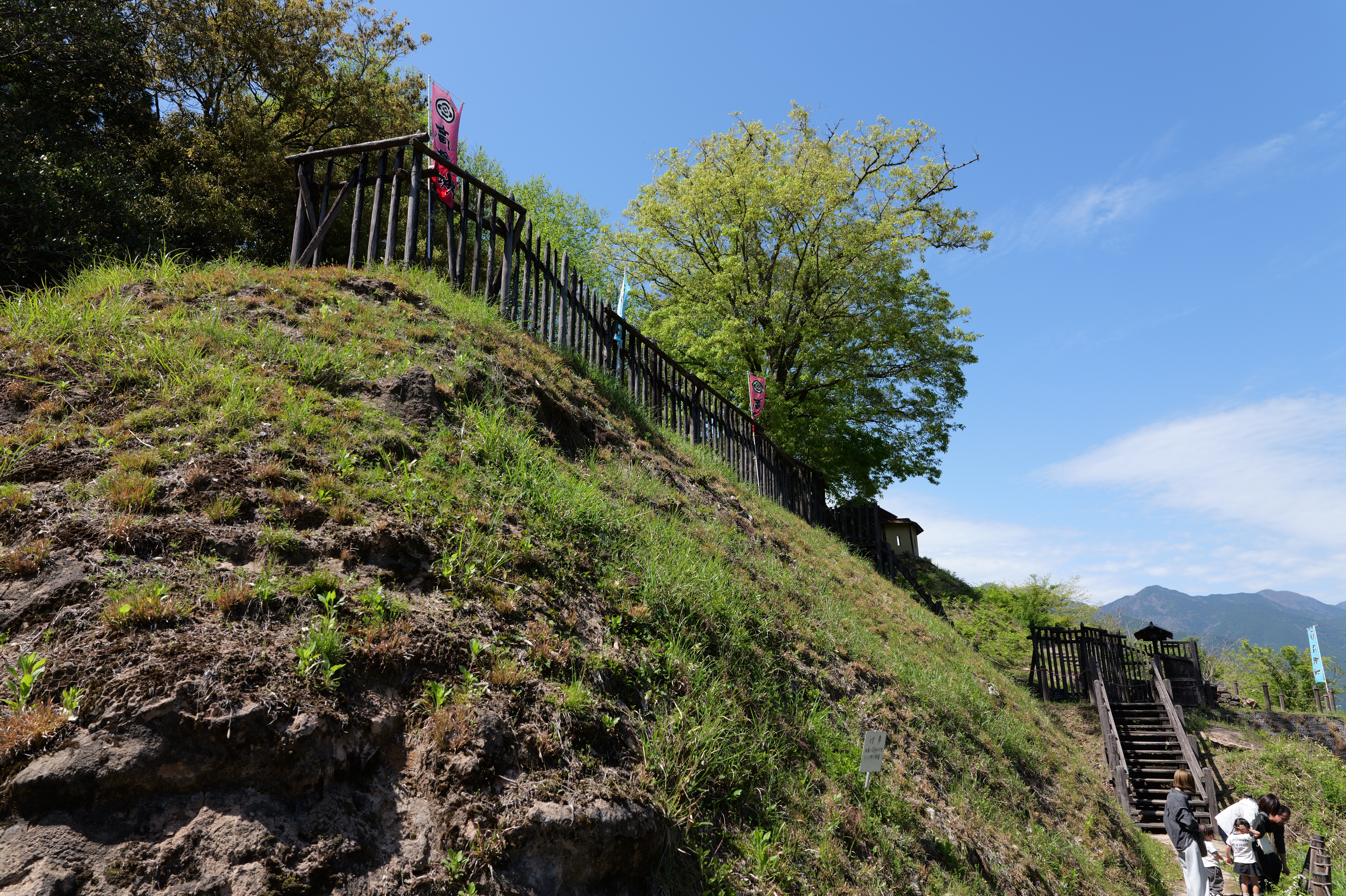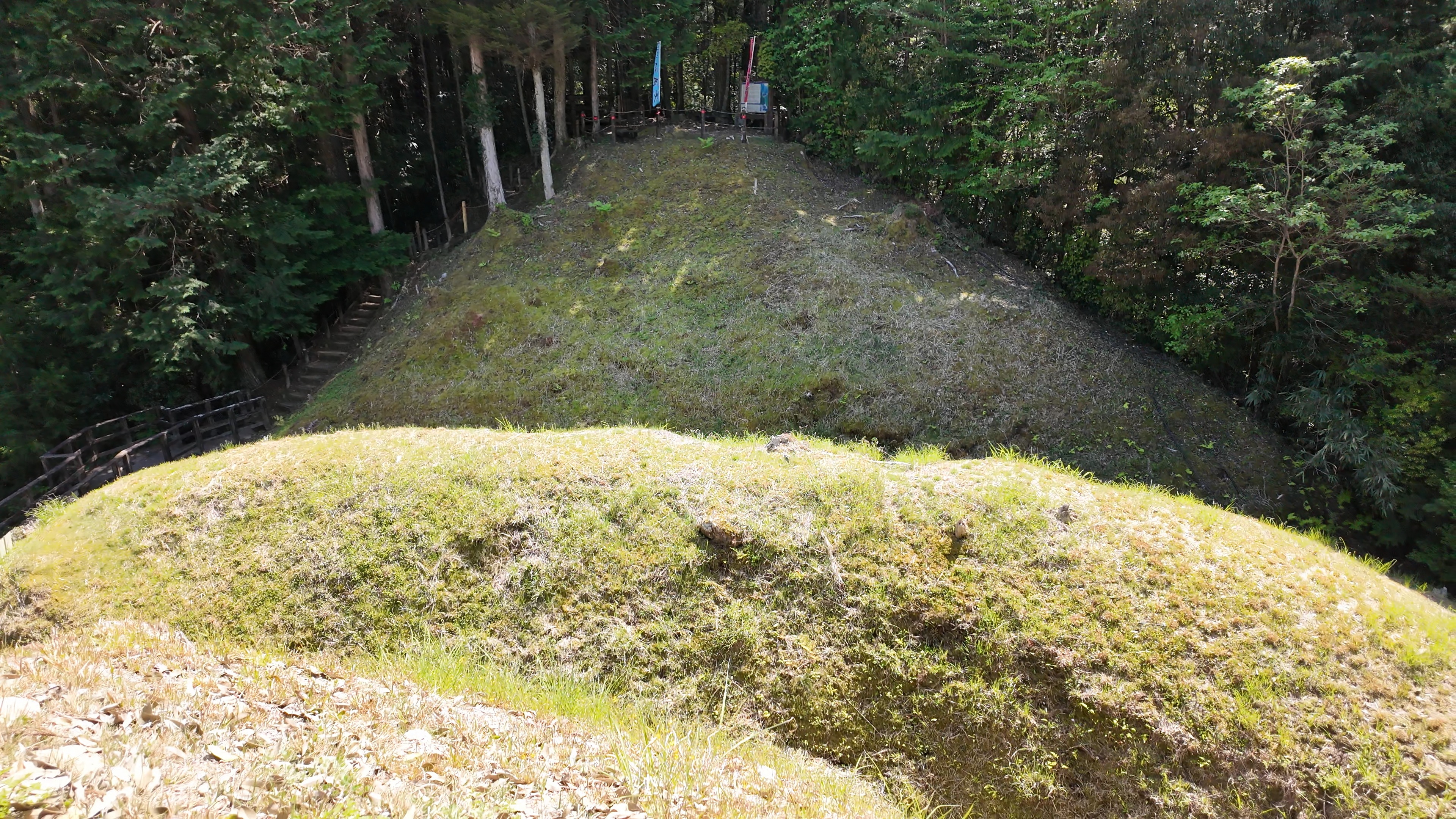 楽道最寄りの駐車場には12:54到着、確かに坂も少なく楽な道を6分ほど歩くと、三の曲輪と二重堀切を挟んだ対面、二の曲輪まで見渡せる城外の高台に出ます。復元された柵列がいかにも山の砦のような雰囲気を醸し出しています。