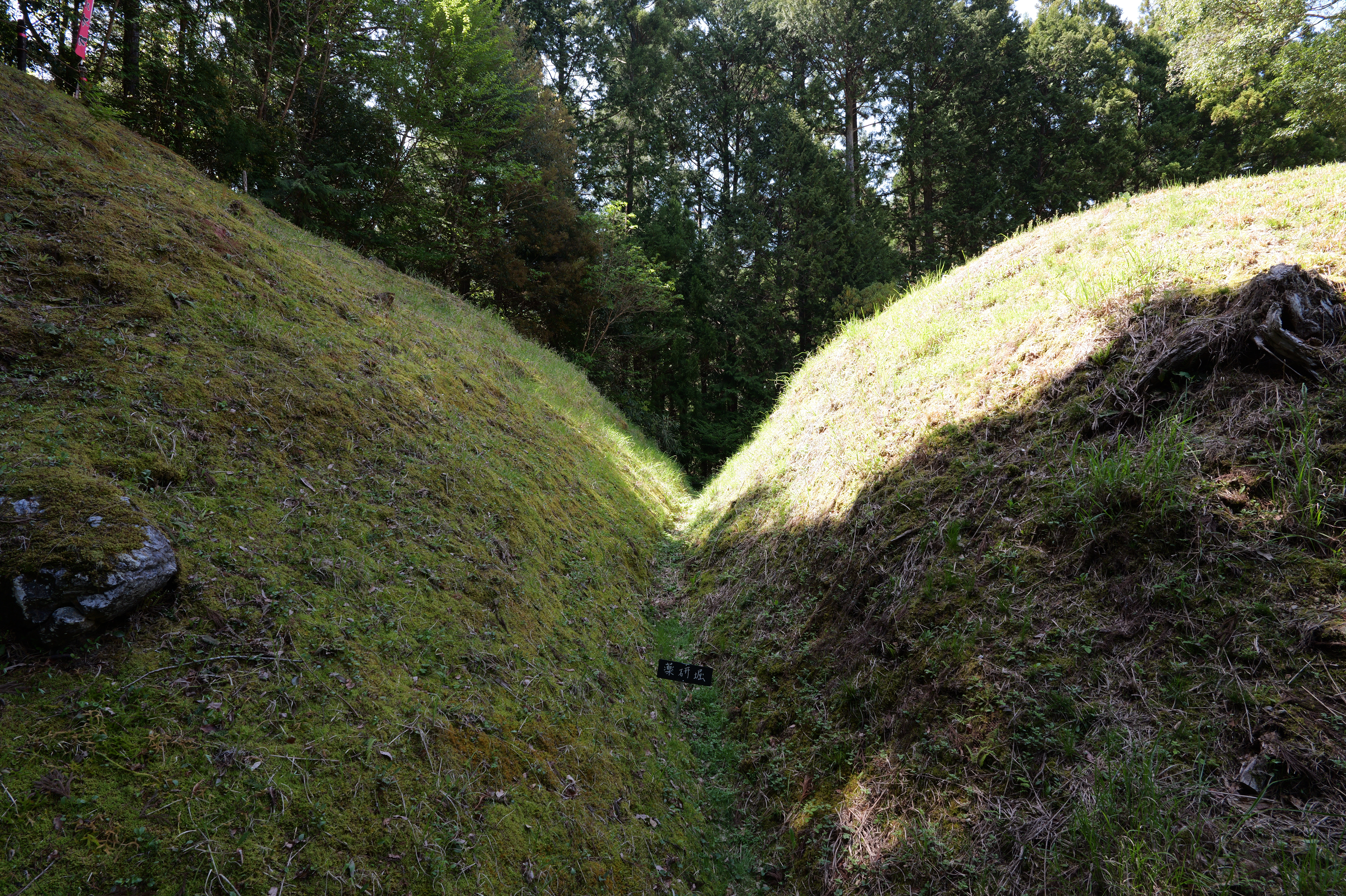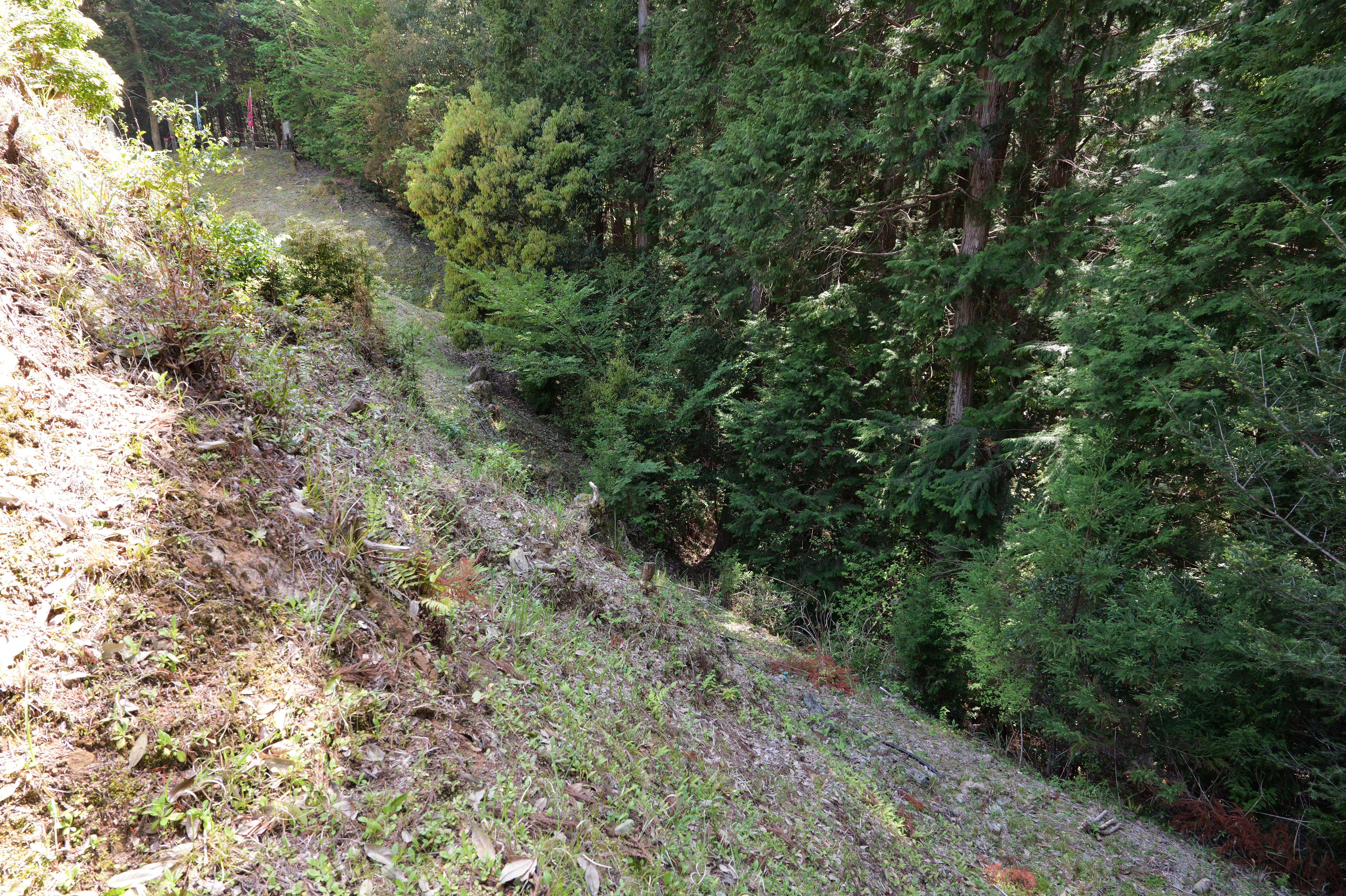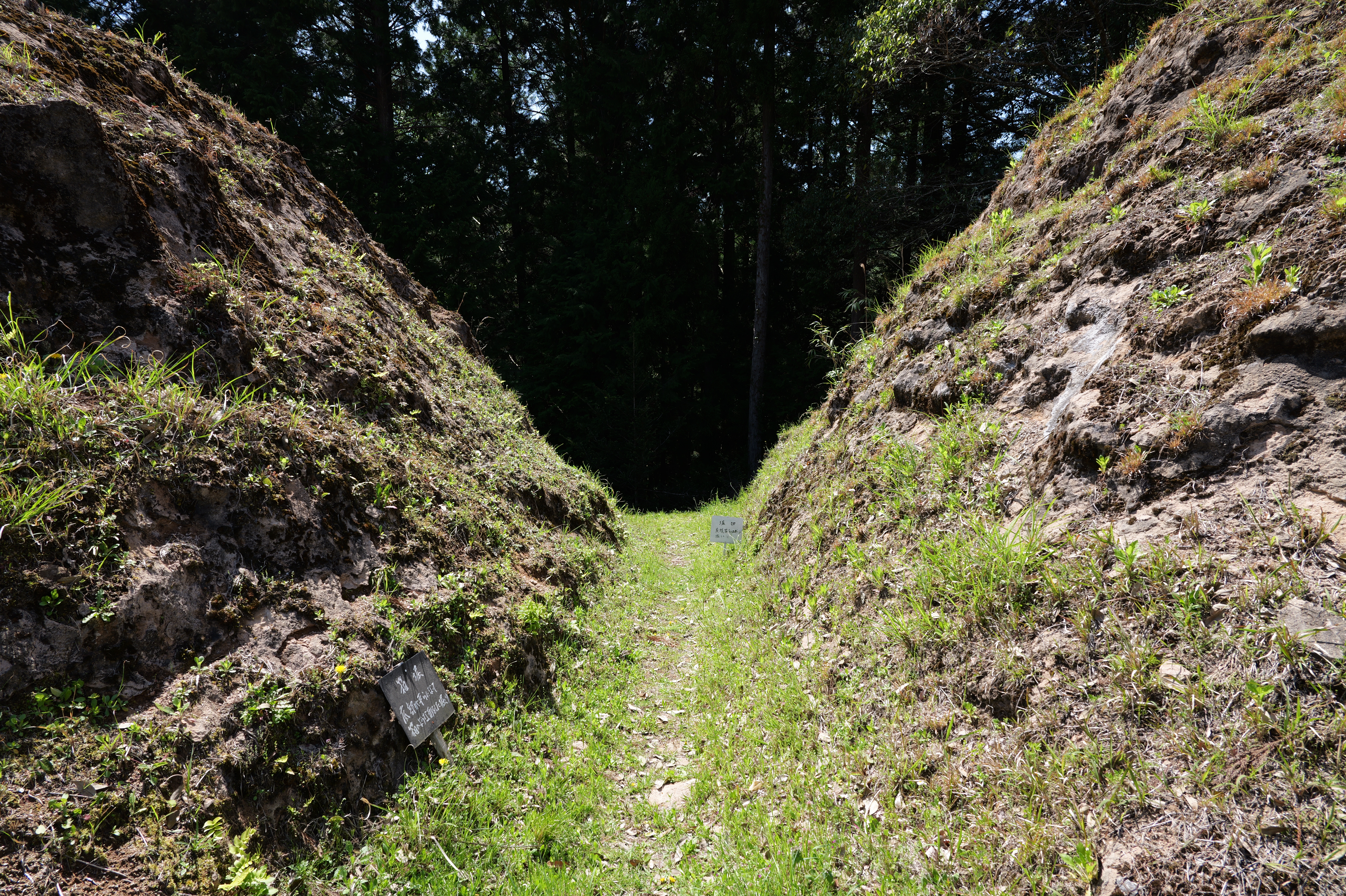 高台から階段を下りると二重堀切で城の南端部です。幅約29m中央に高さ約4mの土塁があります。堀は薬研堀です。その先階段を登ると三の曲輪です。