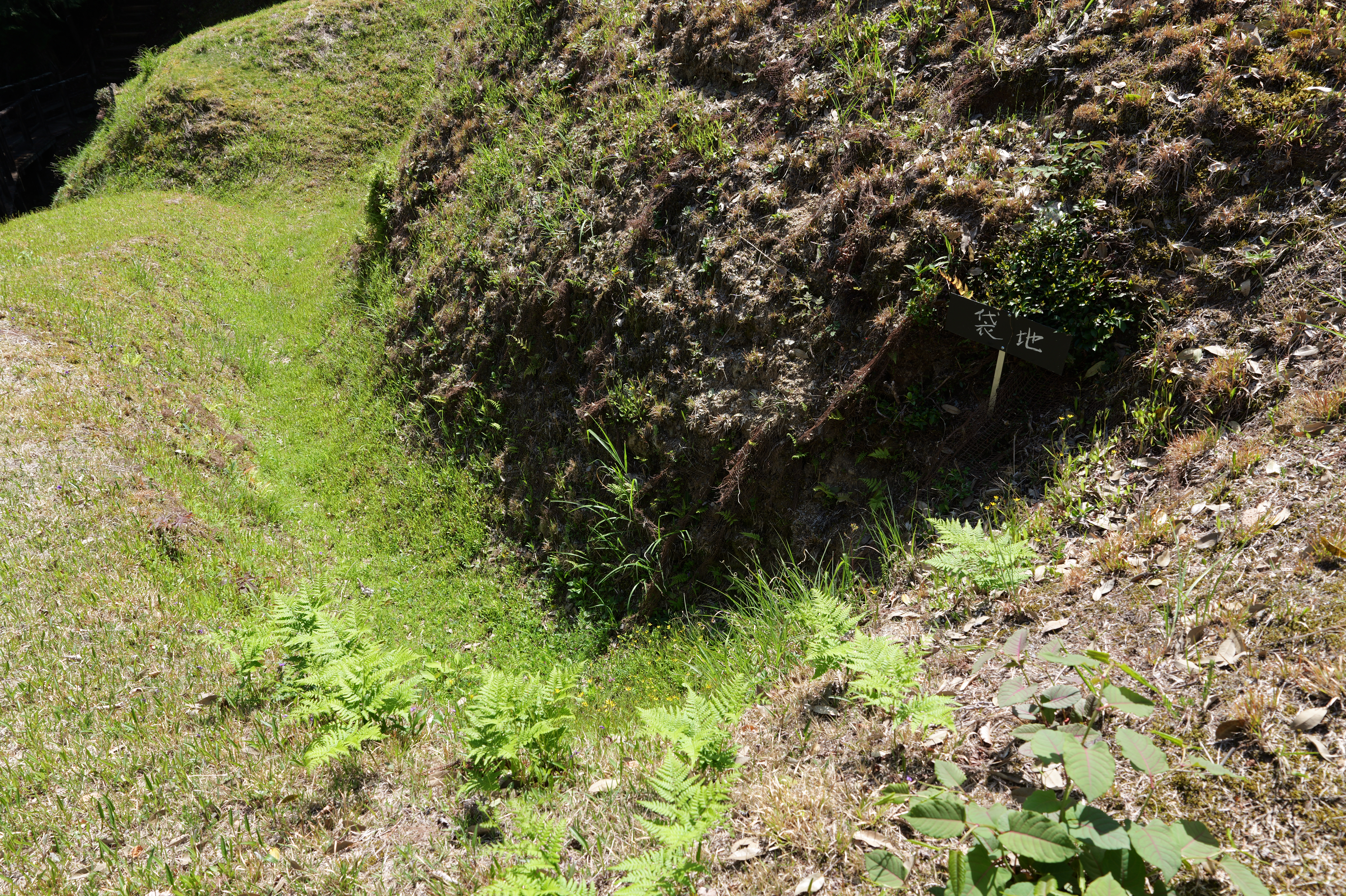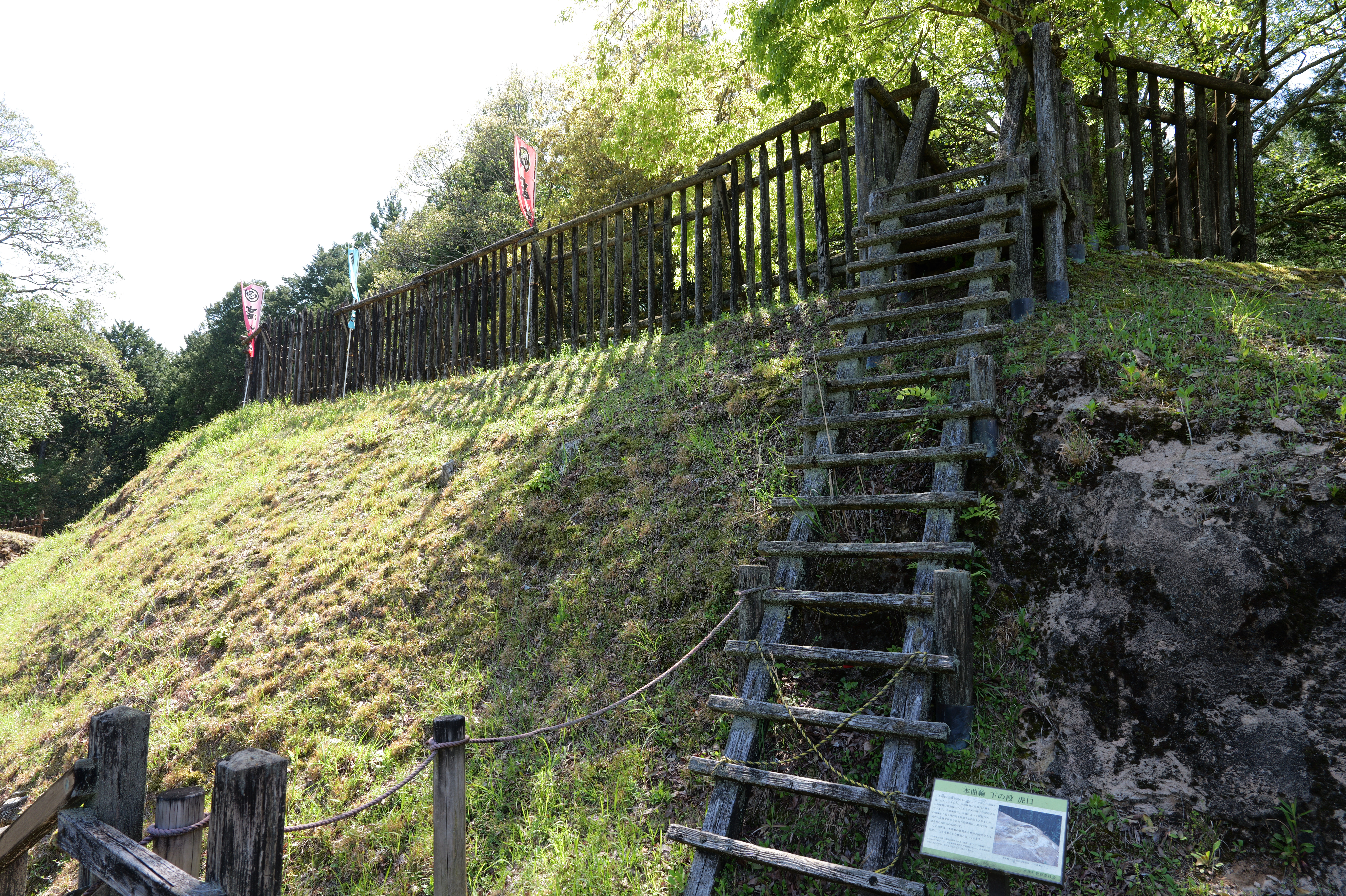 三の曲輪の先は堀切を挟んで二の曲輪につながります。堀切の東端は土橋になっています。二の曲輪の切岸に沿って進んで階段を上がると小曲輪に出ます。正面に木橋と門、左側に二の曲輪へ上がるはしごがあります。はしごの設置場所は当時のままですが形状は違うそうで、安全確保を優先しているそうな。それでもかなり気をつけて登らないと危ないです。