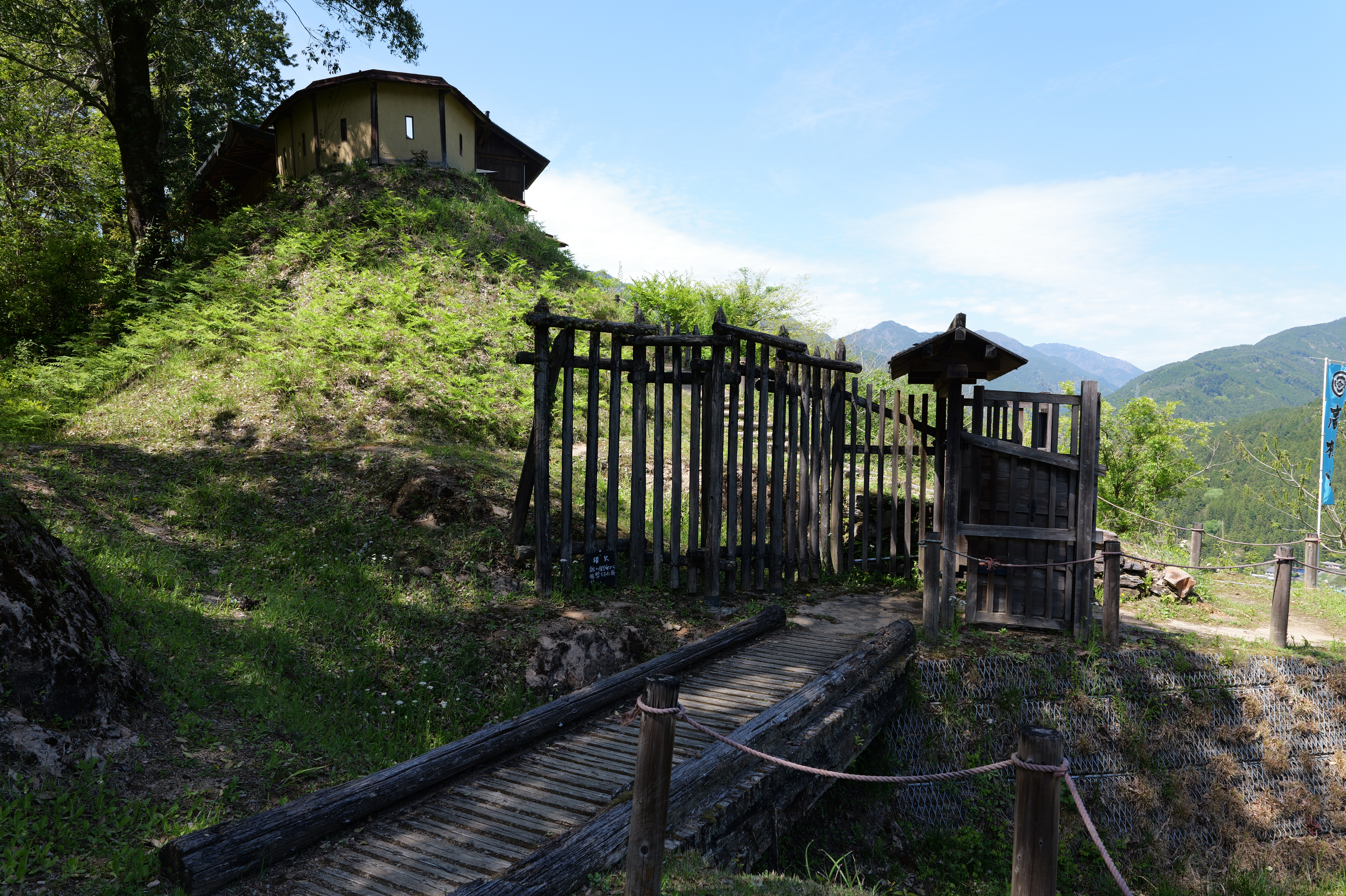 木橋を渡ったところも小曲輪になっています。階段の先は本曲輪の搦手門です。本曲輪には、主殿、井楼櫓、倉庫、城門や土塀が復元されています。いやぁ、この雰囲気はすごくいいですね、よくぞここまで復元したものです。