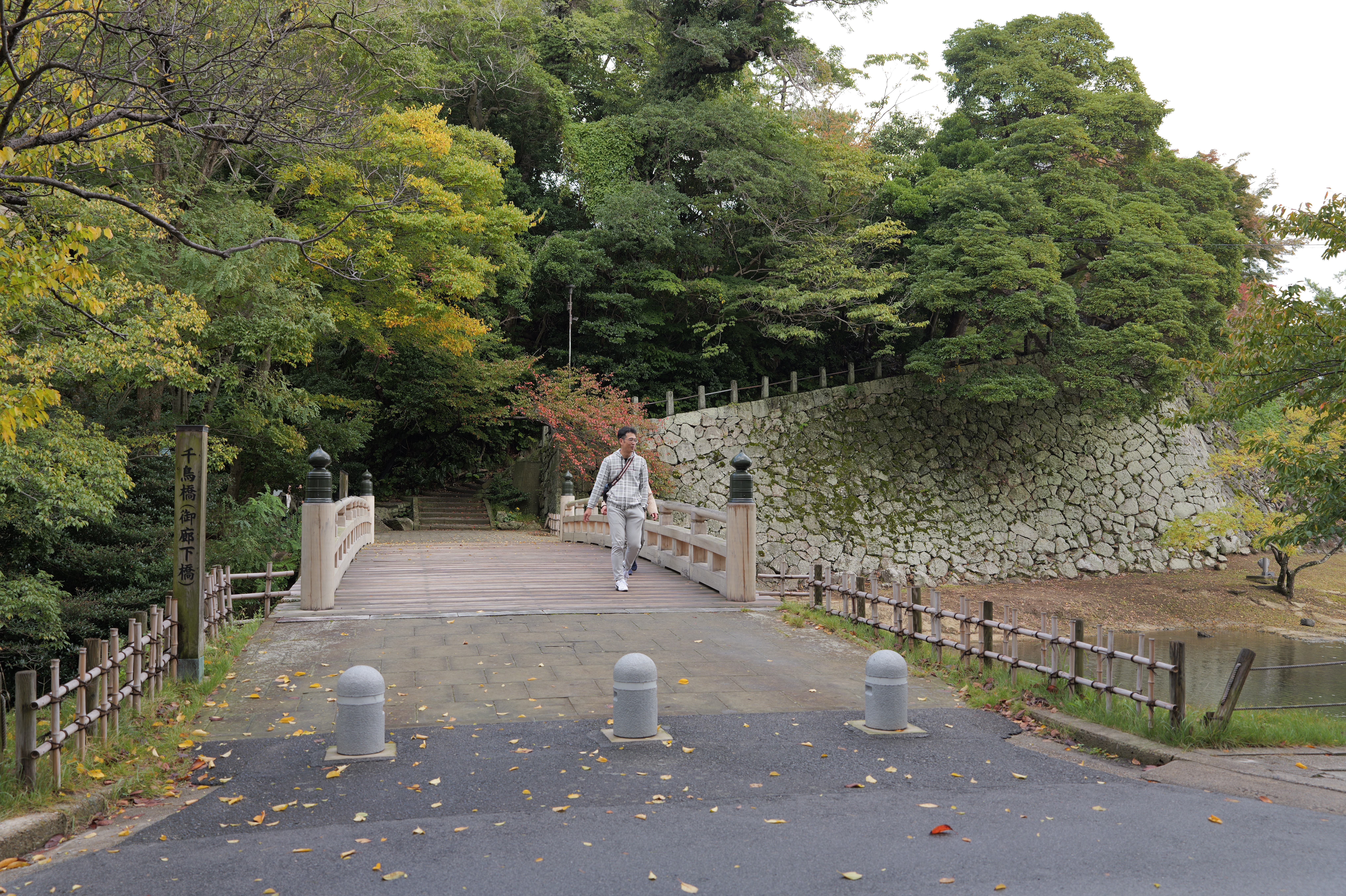 駐車場から堀の橋を渡り、現在島根県庁がある三之丸を内堀沿いに進みり、内堀にかかる千鳥橋から城跡に入ります。千鳥橋はかつては屋根付きの廊下橋でした。橋を渡り右の坂を登ると南門に出て、その先は二之丸です。