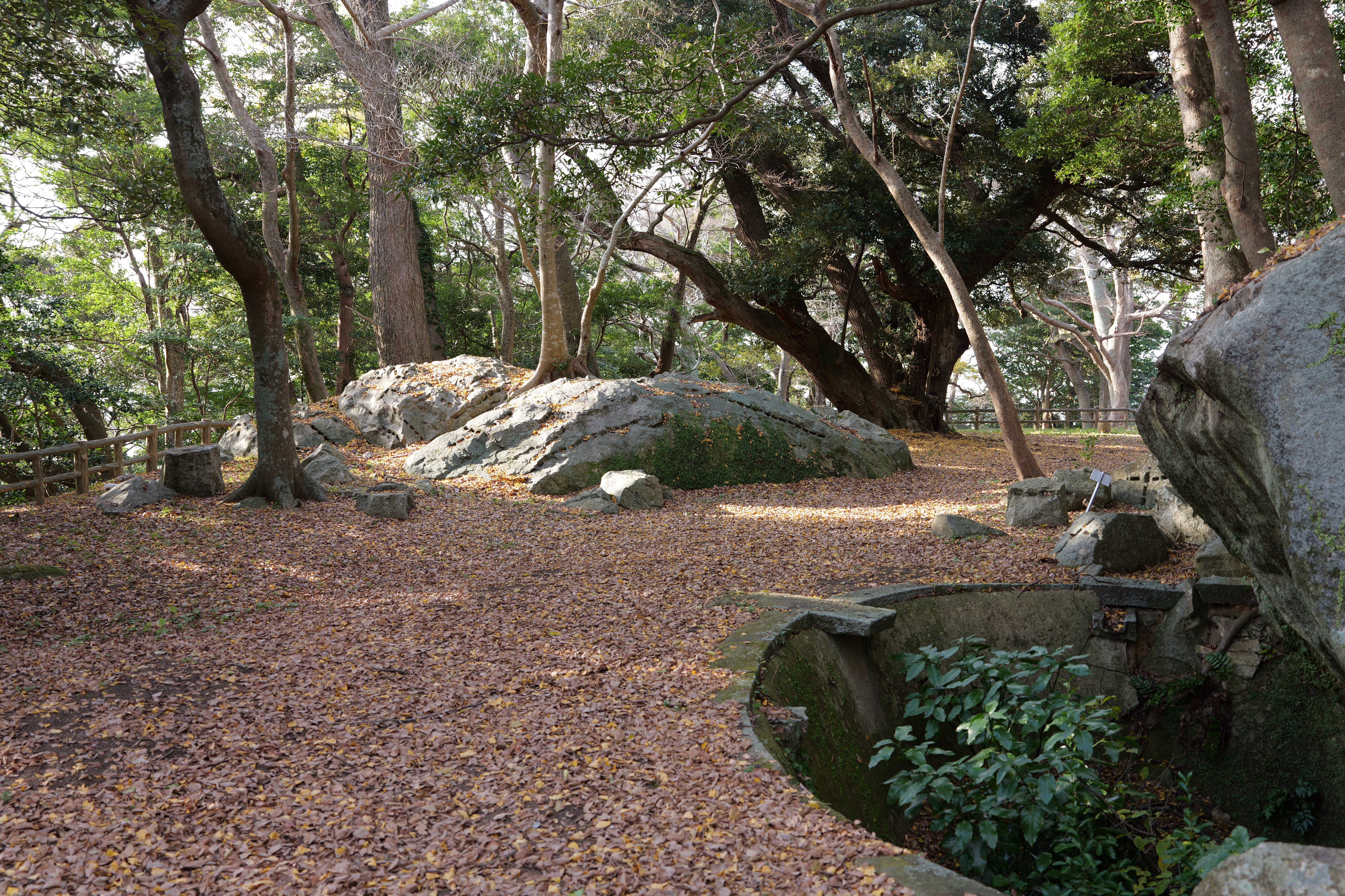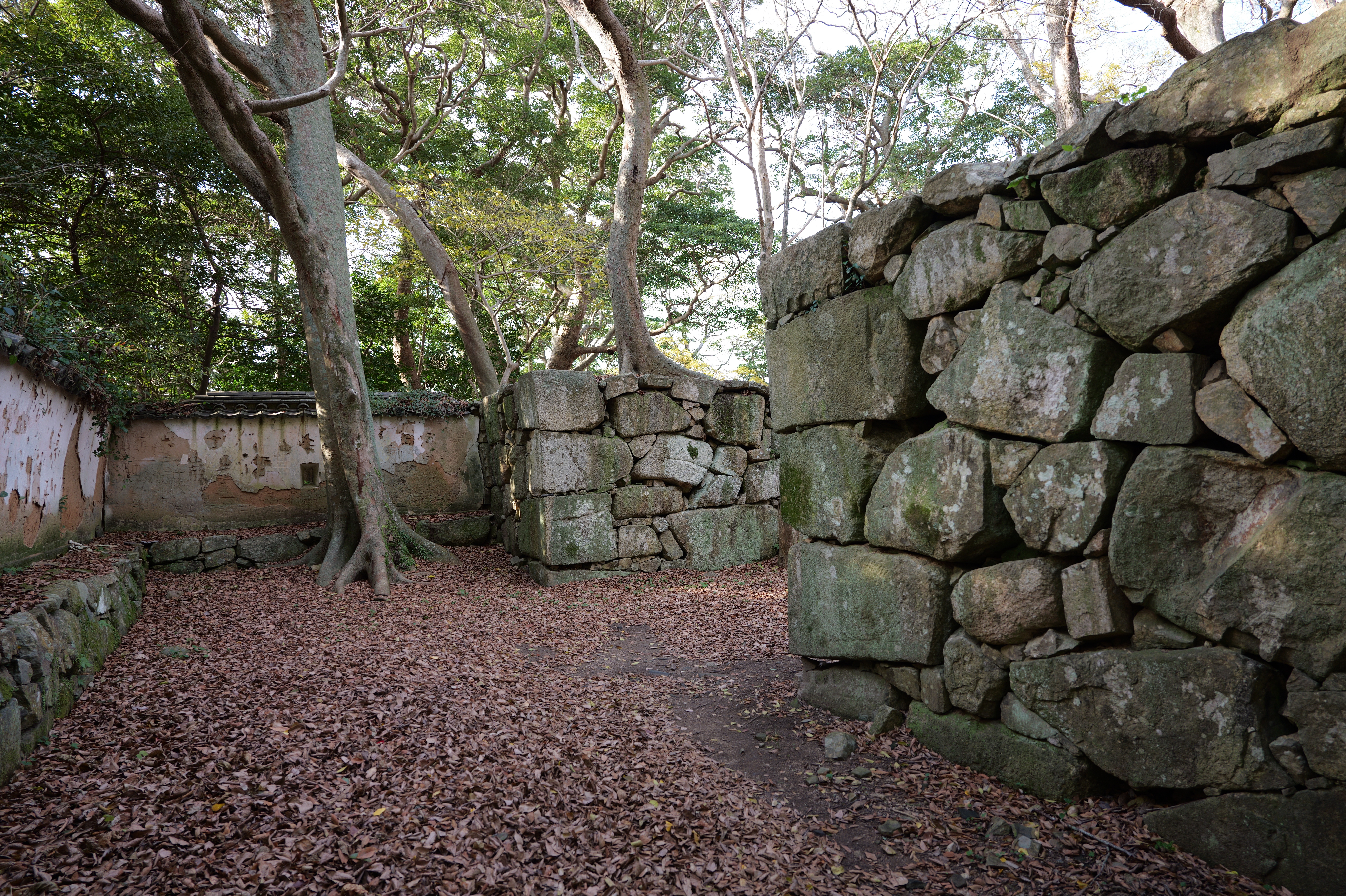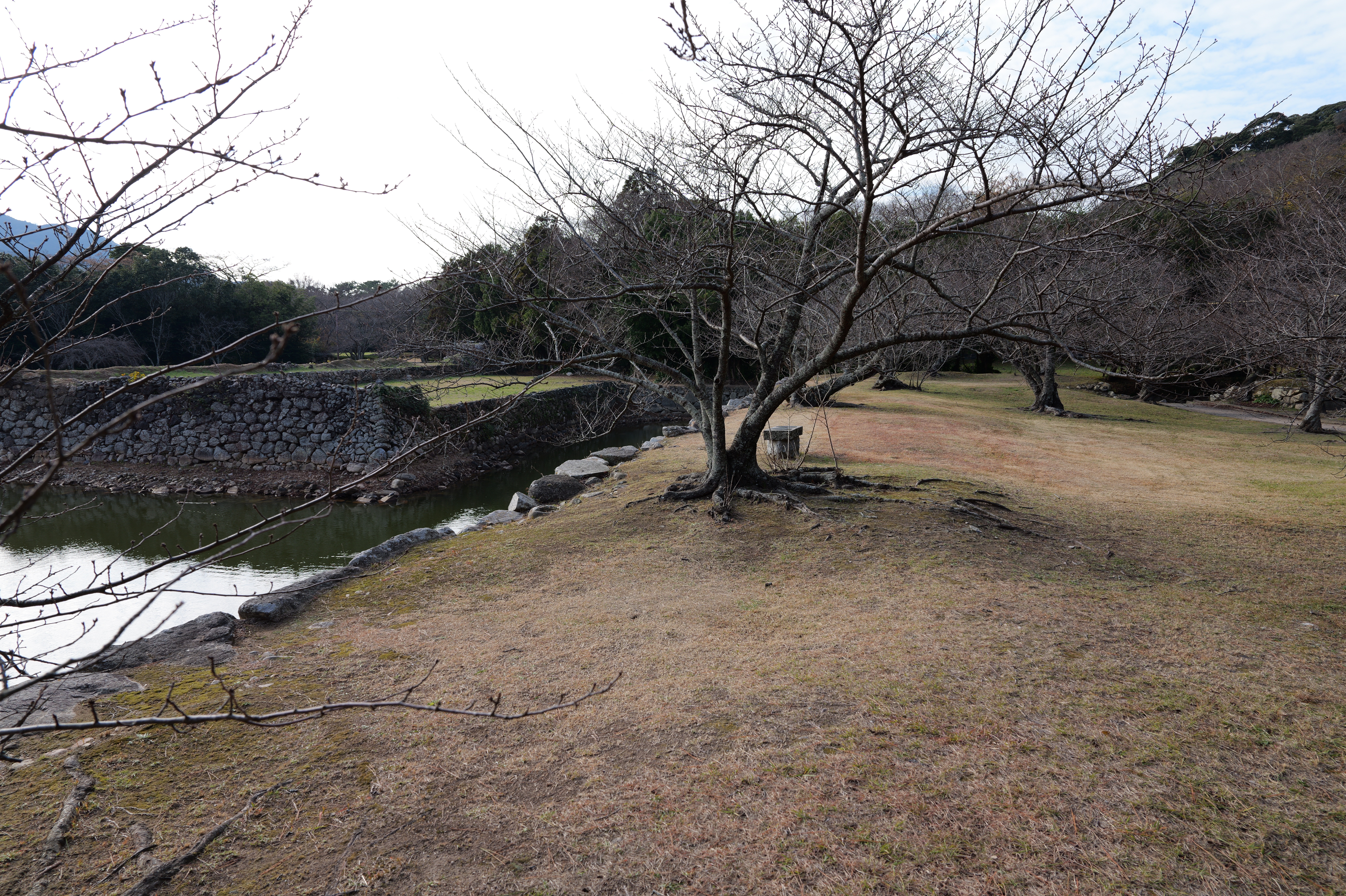 指月公園の出口から再度二の丸へ。南北に伸びる道をずっと北へ進んでたどり着いたのは北矢倉跡でした。途中にいくつか矢倉跡があるようですが、確認できず。北矢倉跡を抜けると海です。