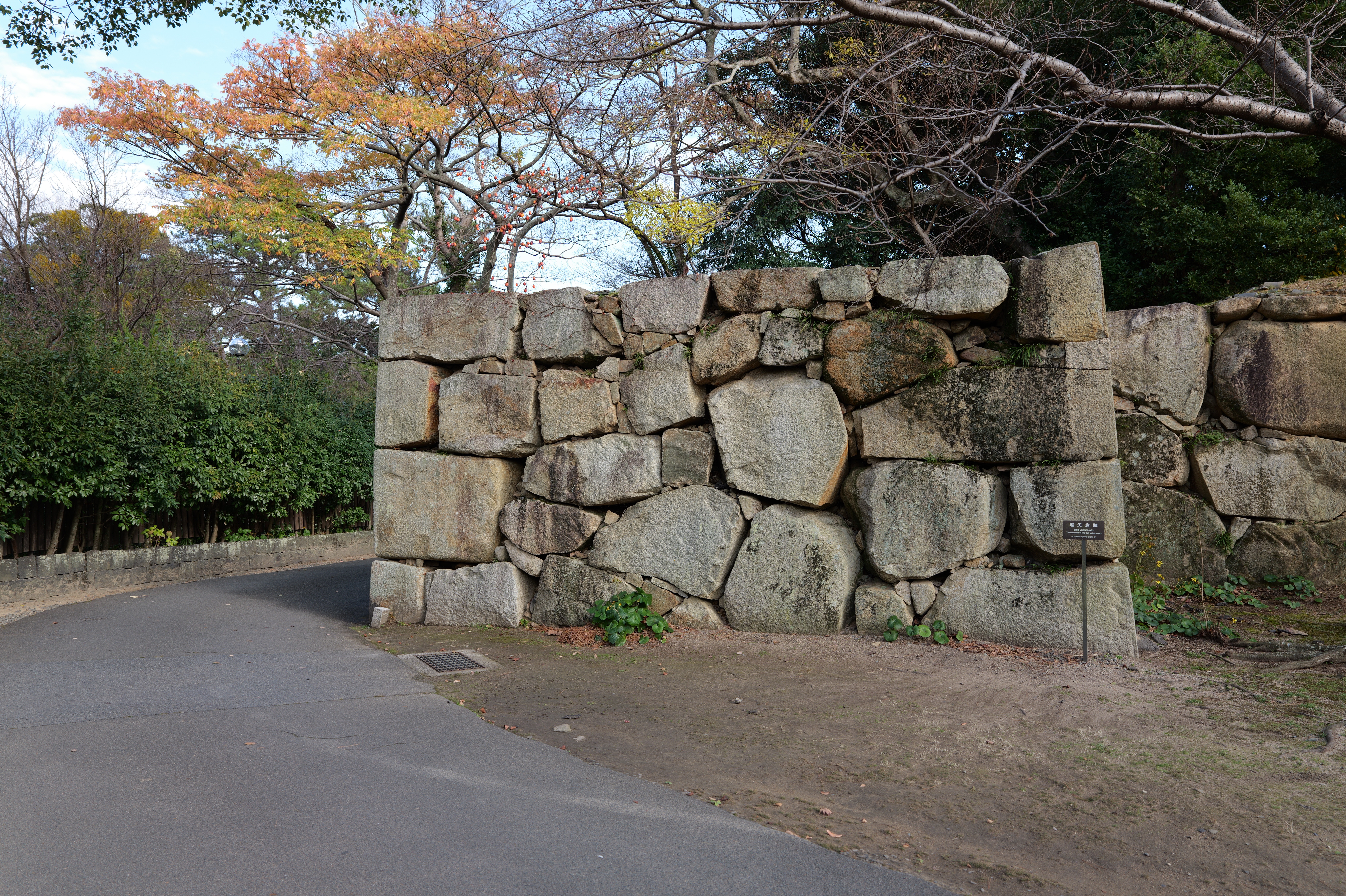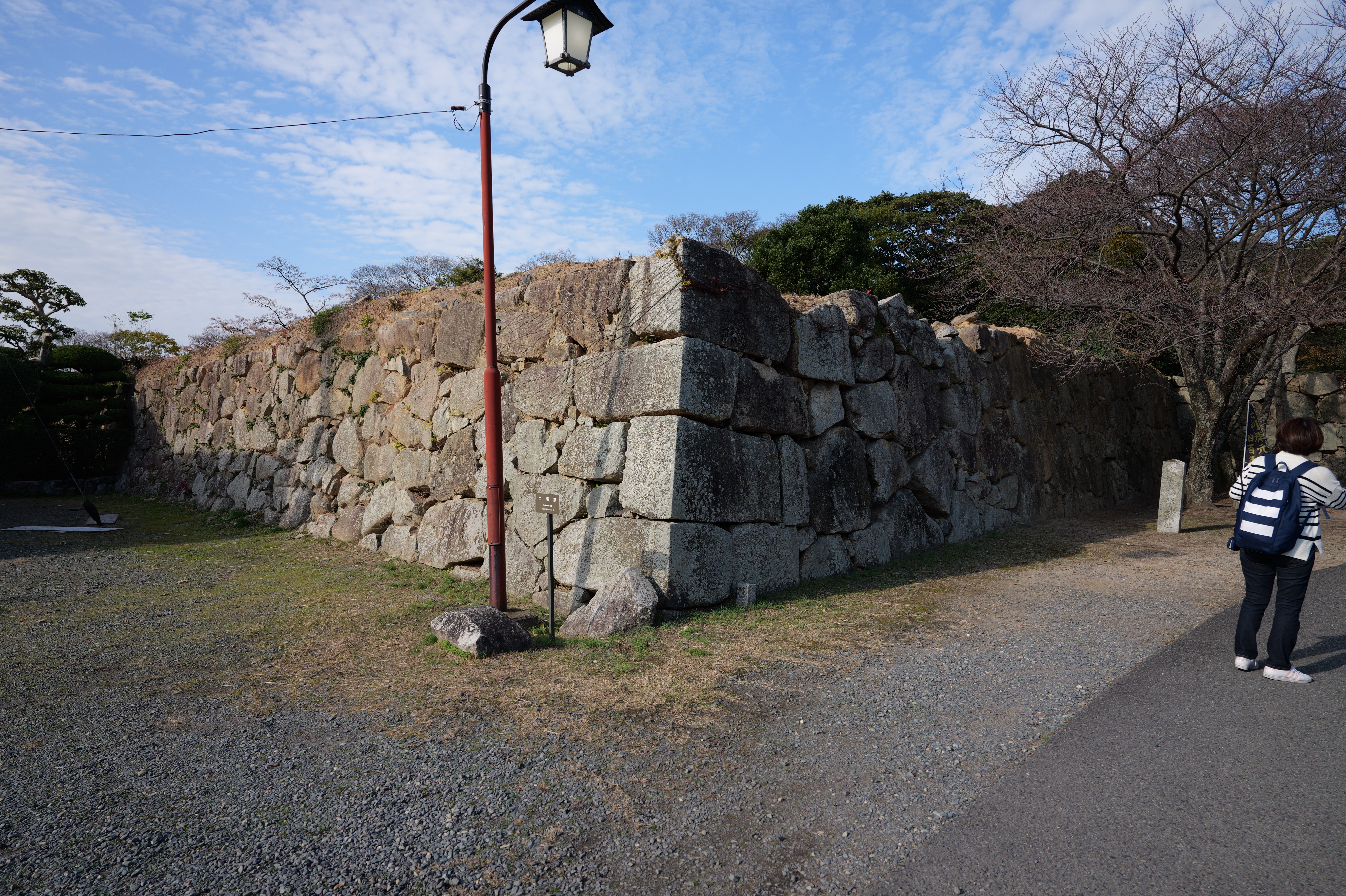 南方向に戻って潮入門跡。門の外は海浜で門の石垣上には復元された二の丸土塀(銀眼土塀)がずっと伸びています。さらに南には紙矢倉跡があり、そのあたりから内堀が南へ伸びています。華矢倉跡、東矢倉・東門・時打矢倉跡と進みました。東門の外は三の丸です。