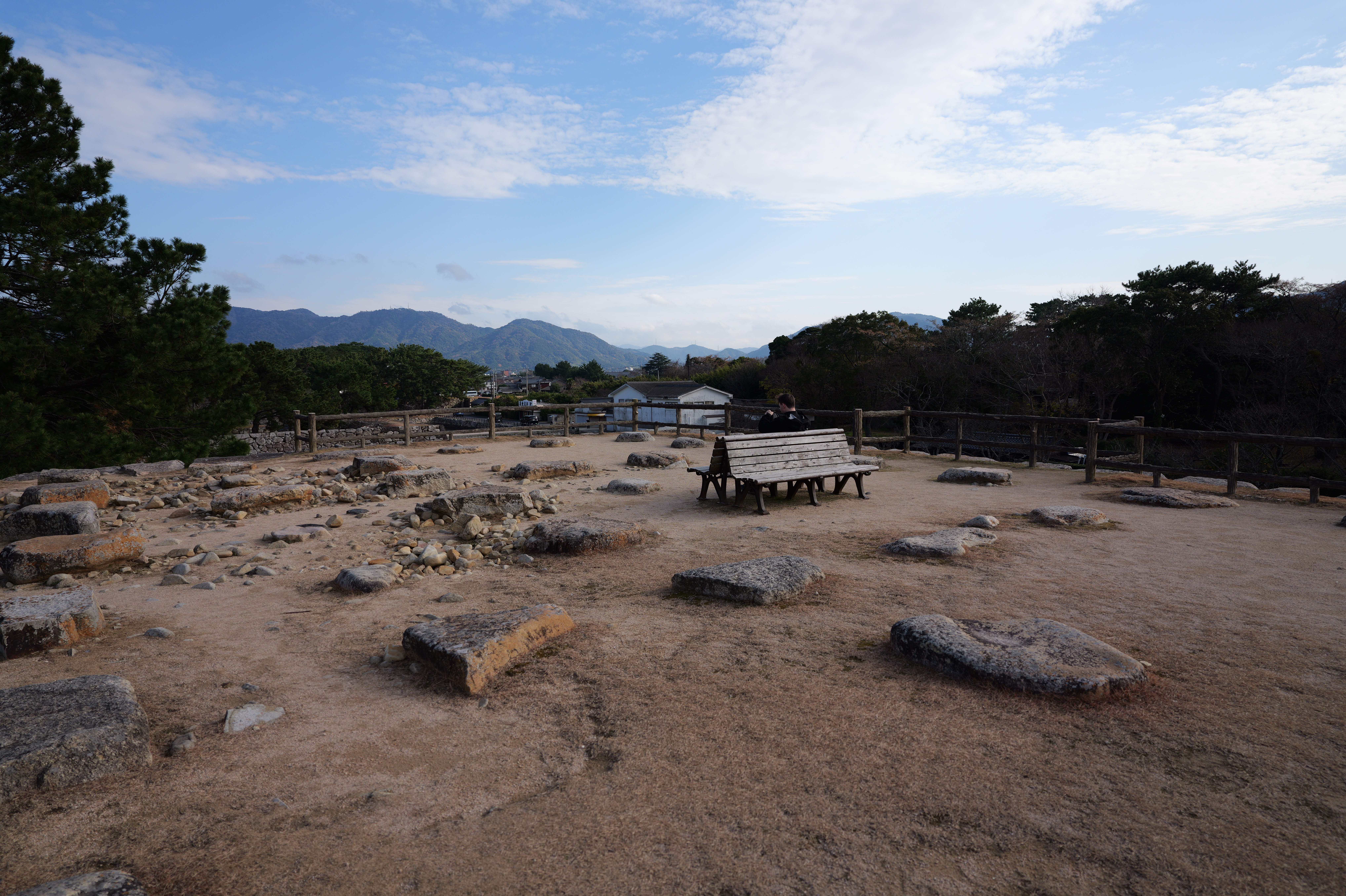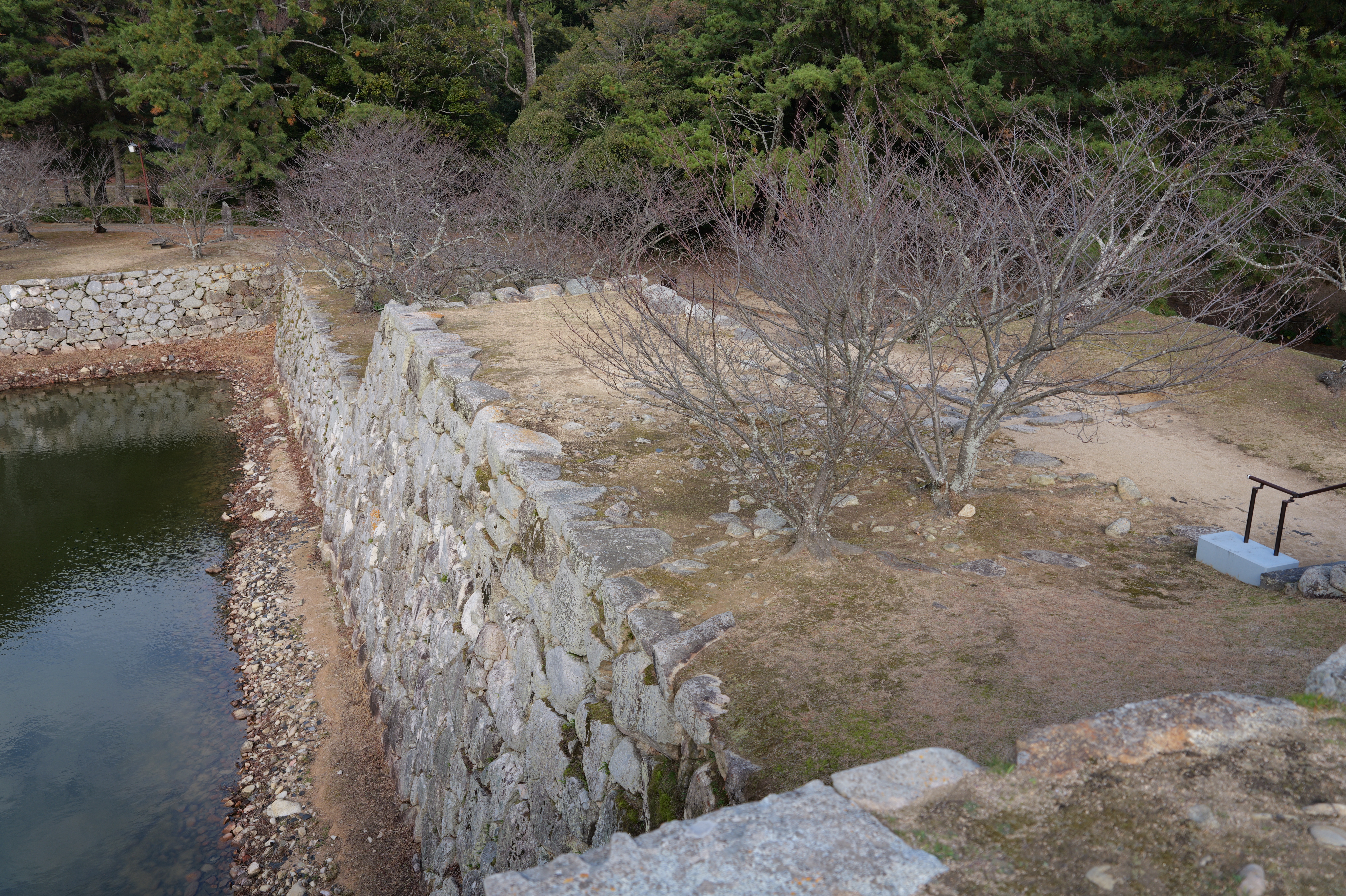 内堀に戻り西へ進んでいくと内堀の西側、岡崎矢倉跡、西門跡、西門跡から本丸に続いています。岡崎矢倉跡脇から西に進む道があり、少し行った右側に洞春寺跡があります。洞春寺は毛利元就の菩提寺でここに移され、のちに山口へ移されたそうです。さらに北西へしばらく進んでいった先に毛利元就の正室、妙玖の菩提寺だった妙玖寺跡があります。その奥は一段下がって妙玖寺兵倉跡があり、眺望がとてもよいです。最後は西門跡、本丸を経由して二の丸を少し散策後、16:40ごろ駐車場に戻りました。