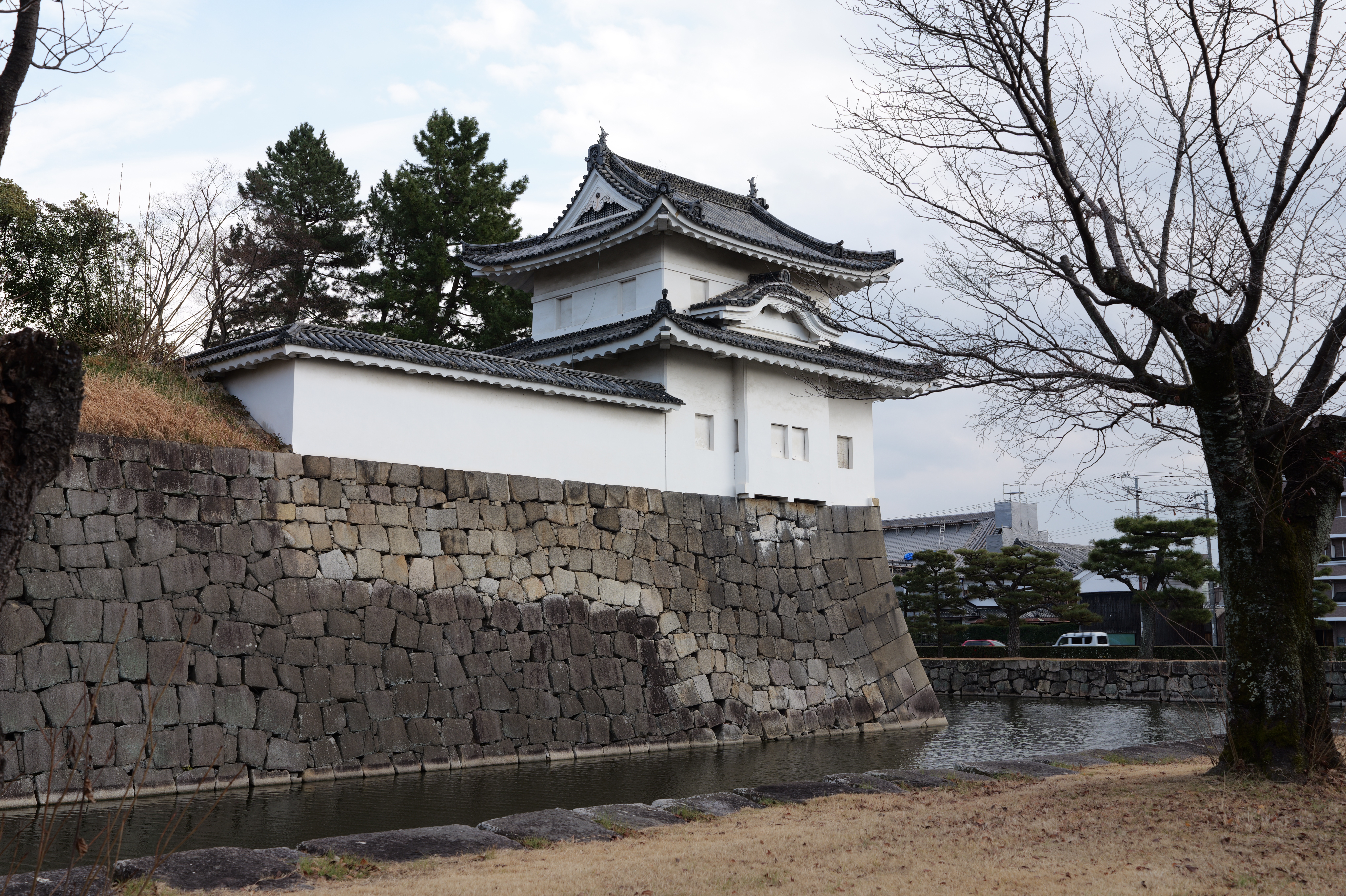 内堀の北西隅に重要文化財の西北土蔵(米蔵)があります。土蔵の西側奥には重要文化財の西門があるのですが、そこまでは立ち入りできず、遠くから眺めるのみです。土蔵を過ぎて内堀沿いに東へ進むと重要文化財の北中仕切門。