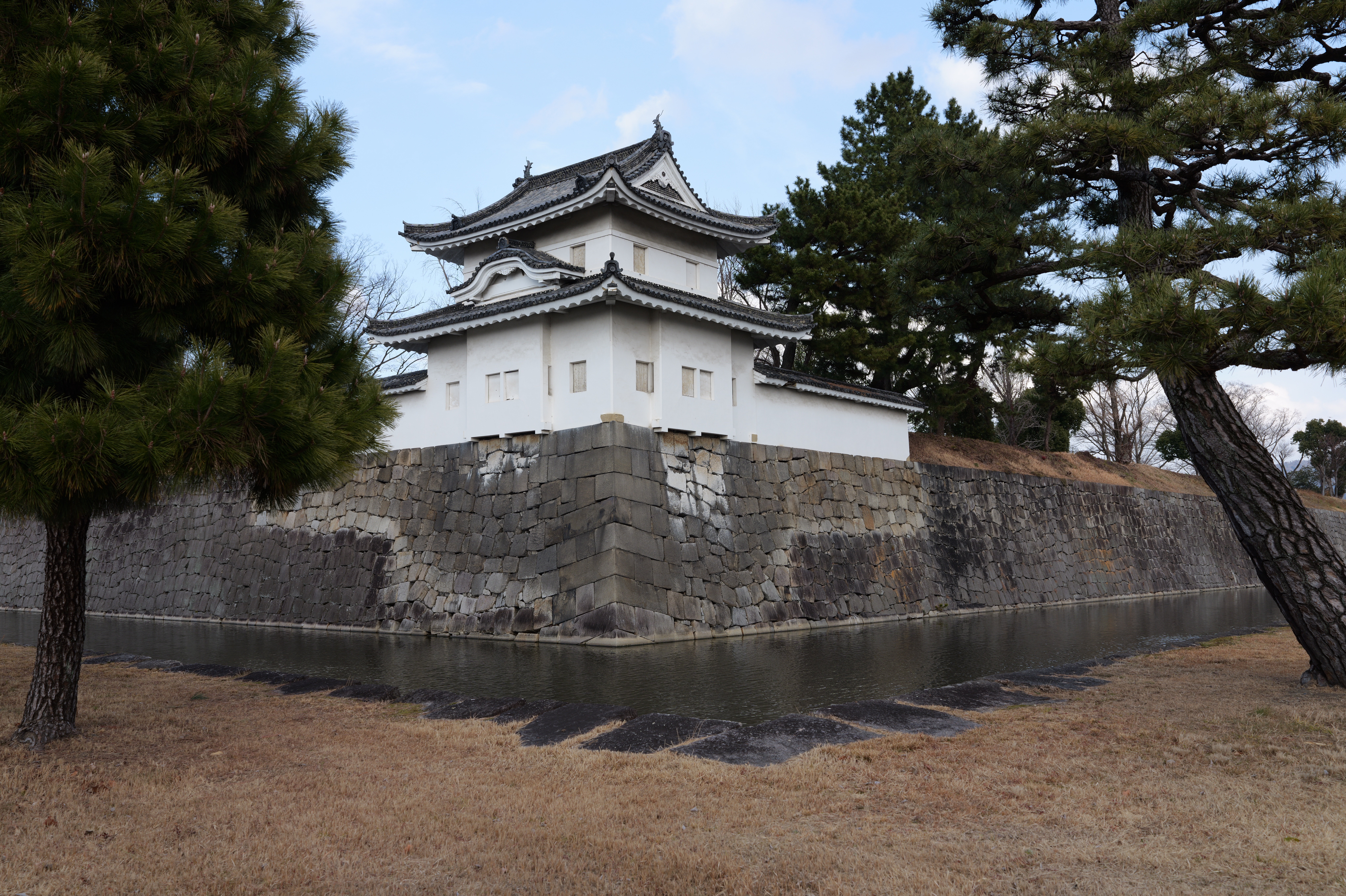 西橋から南へ内堀沿いに進んでいくと内堀南西隅に重要文化財の西南土蔵(米蔵)があります。西橋を挟んで北の西北土蔵と対になっています。土蔵はかつて10つあり、現在は3つ残っています。城に土蔵が残るのは二条城だけだそうです。進むと右側に重要文化財の西南隅櫓。