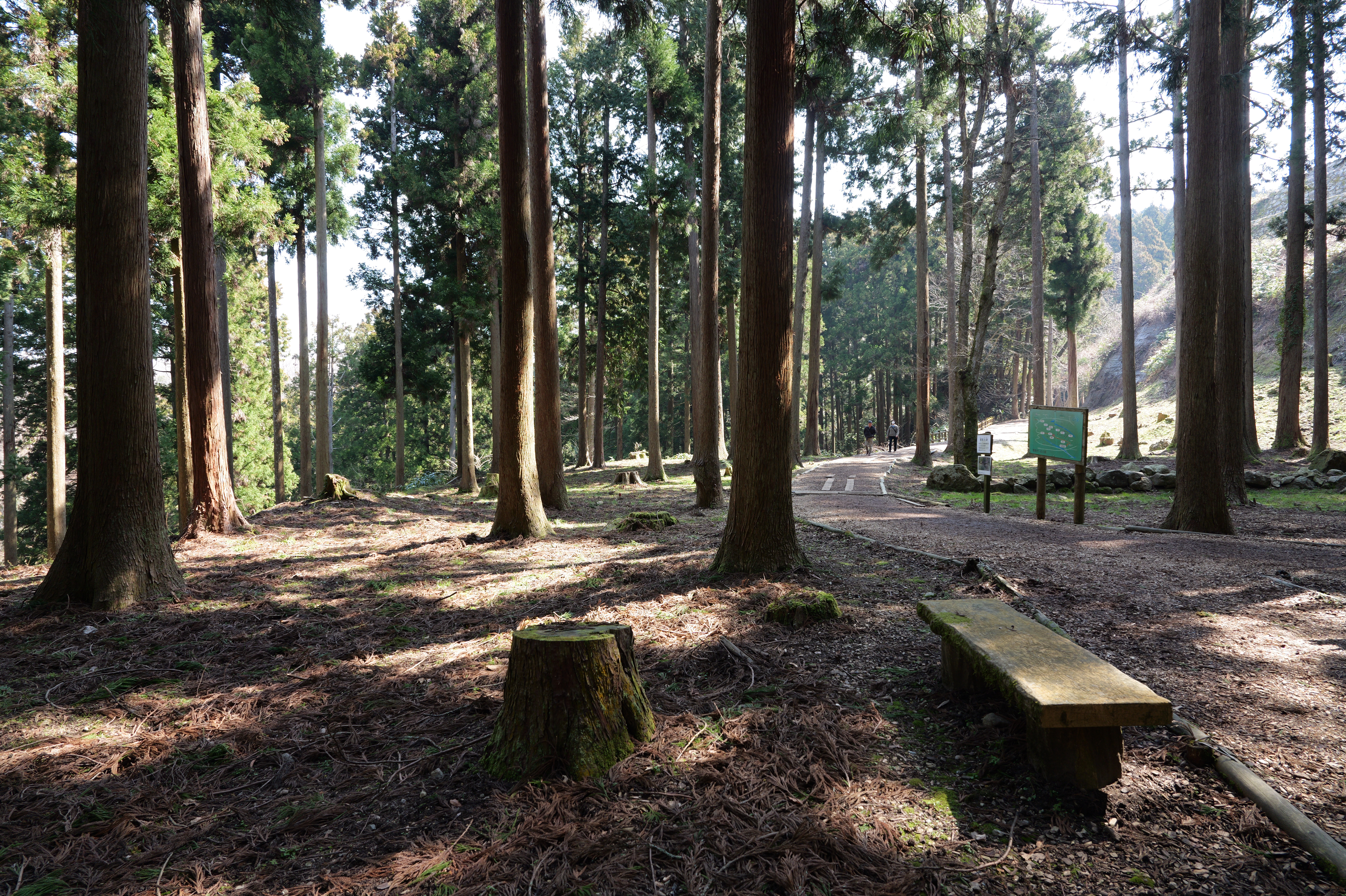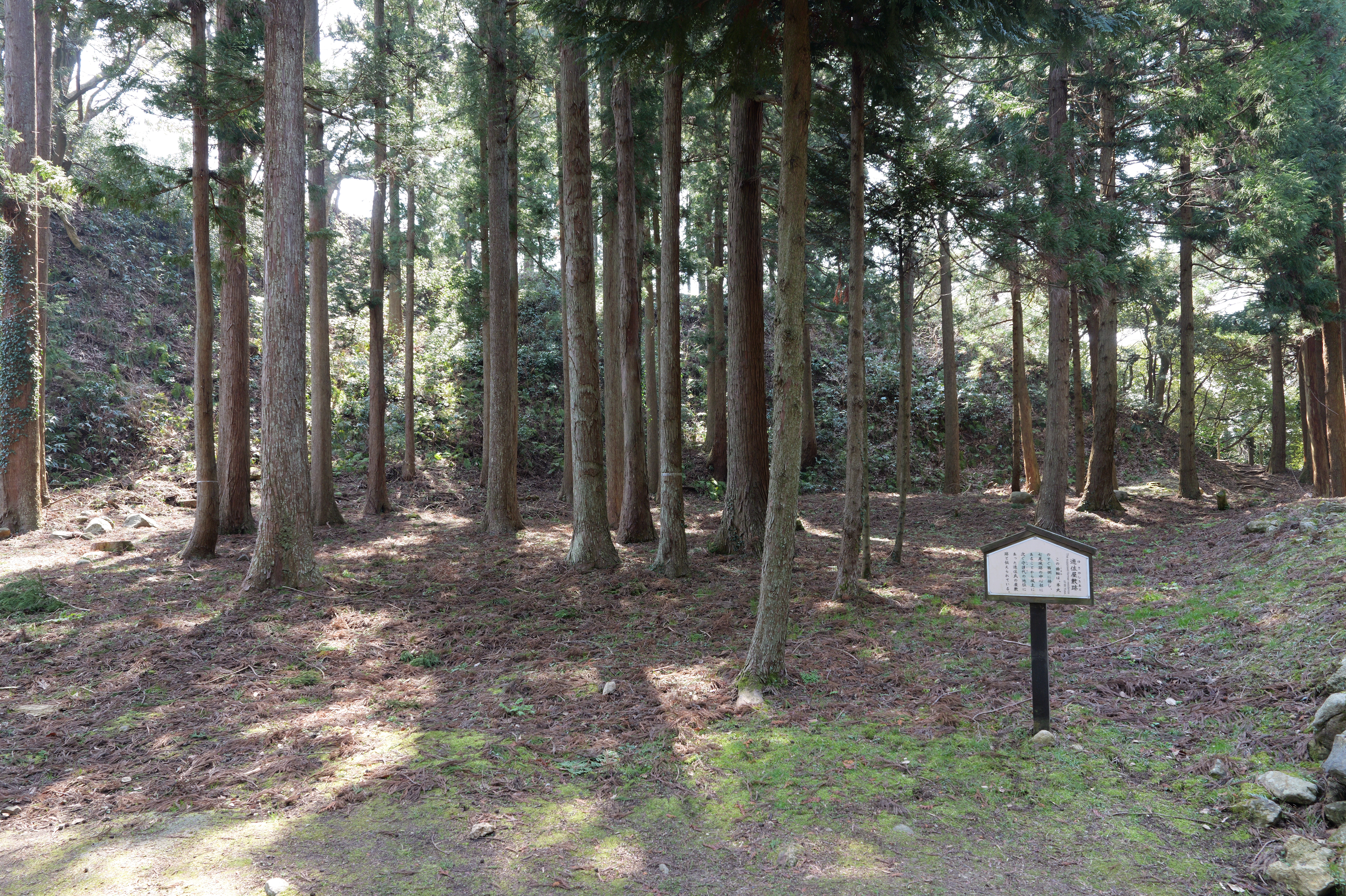 続いて山麓部の散策です。12:30すぎ七尾城登山口駐車場に到着、ここから旧大手道を少し歩きます。旧大手道は七尾城史資料館の駐車場から各所にある案内板に従って進みます。