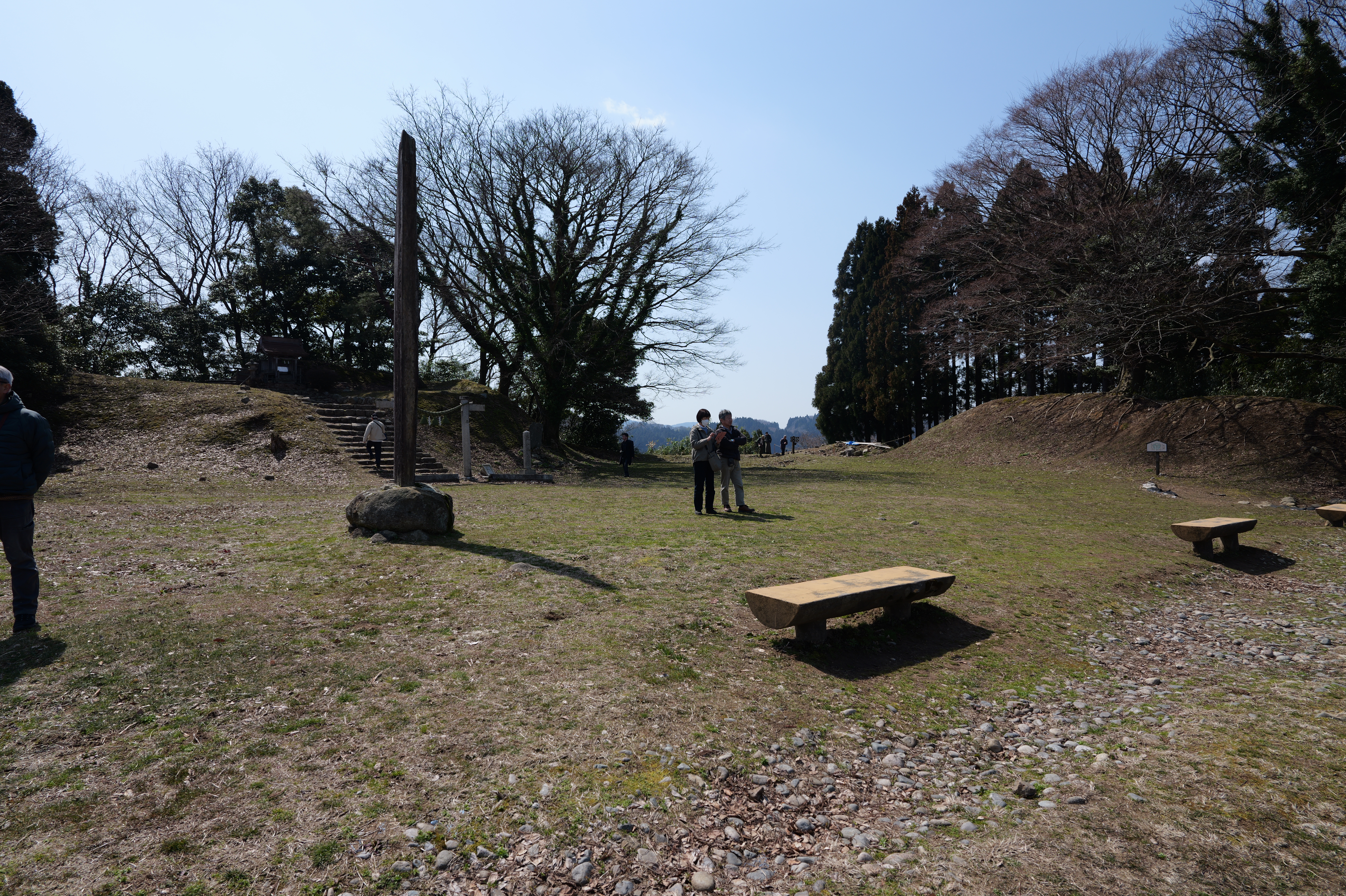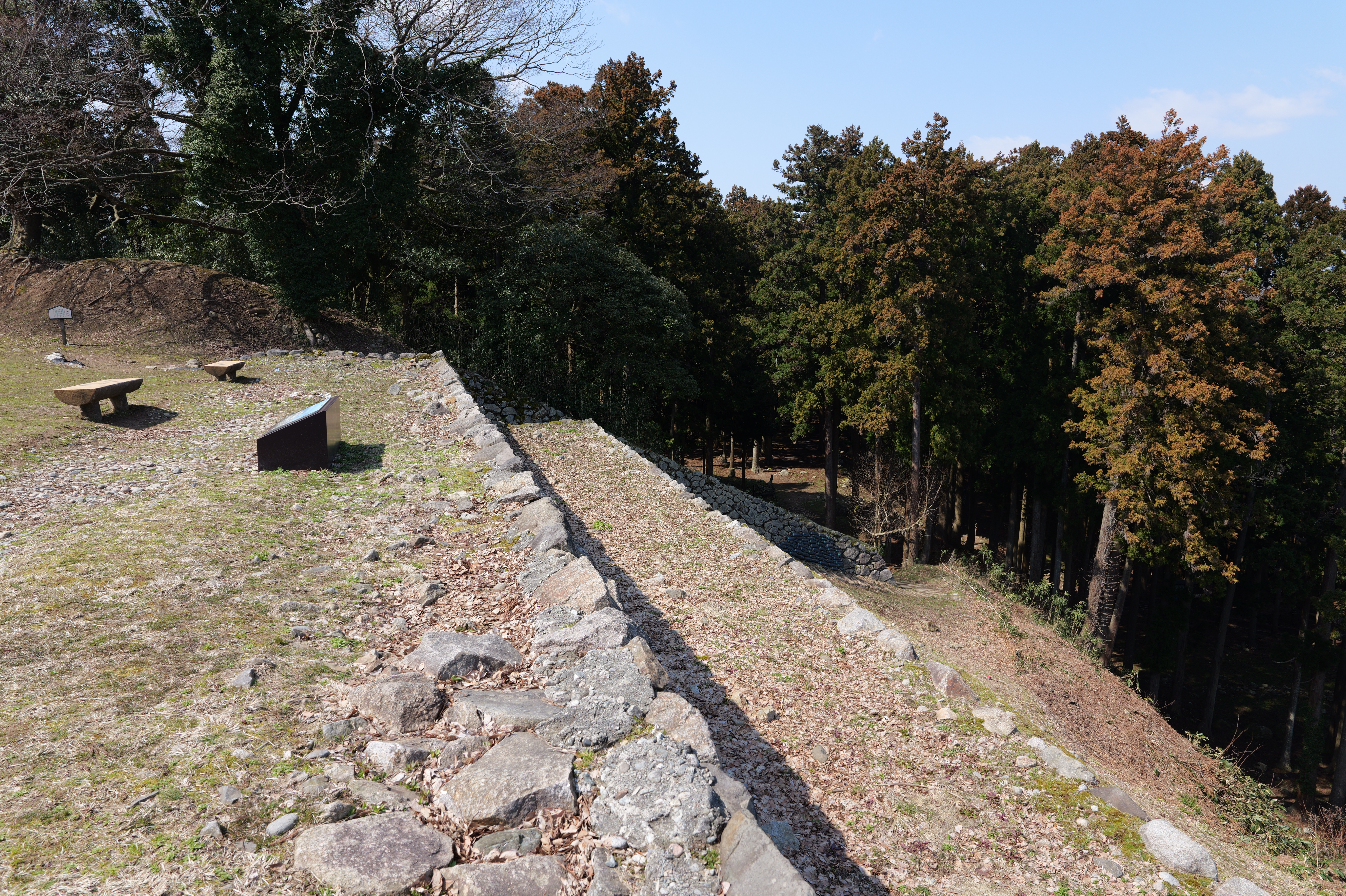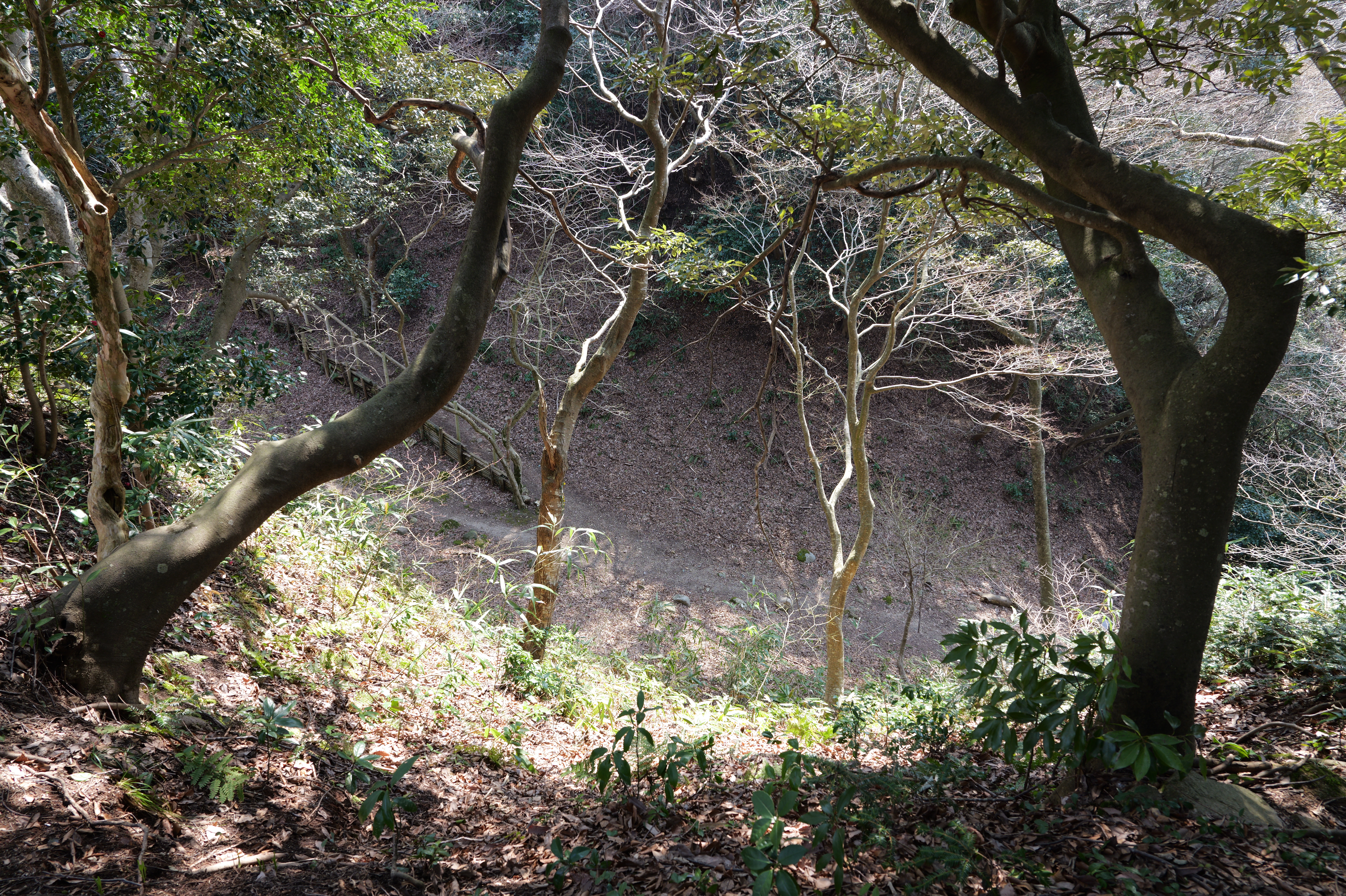 続いて向かう三の丸は少し離れていて、二の丸北側から急な階段を下りて行った先にあります。二の丸と三の丸は幅40m、高さ26mもある大堀切で隔てられています。