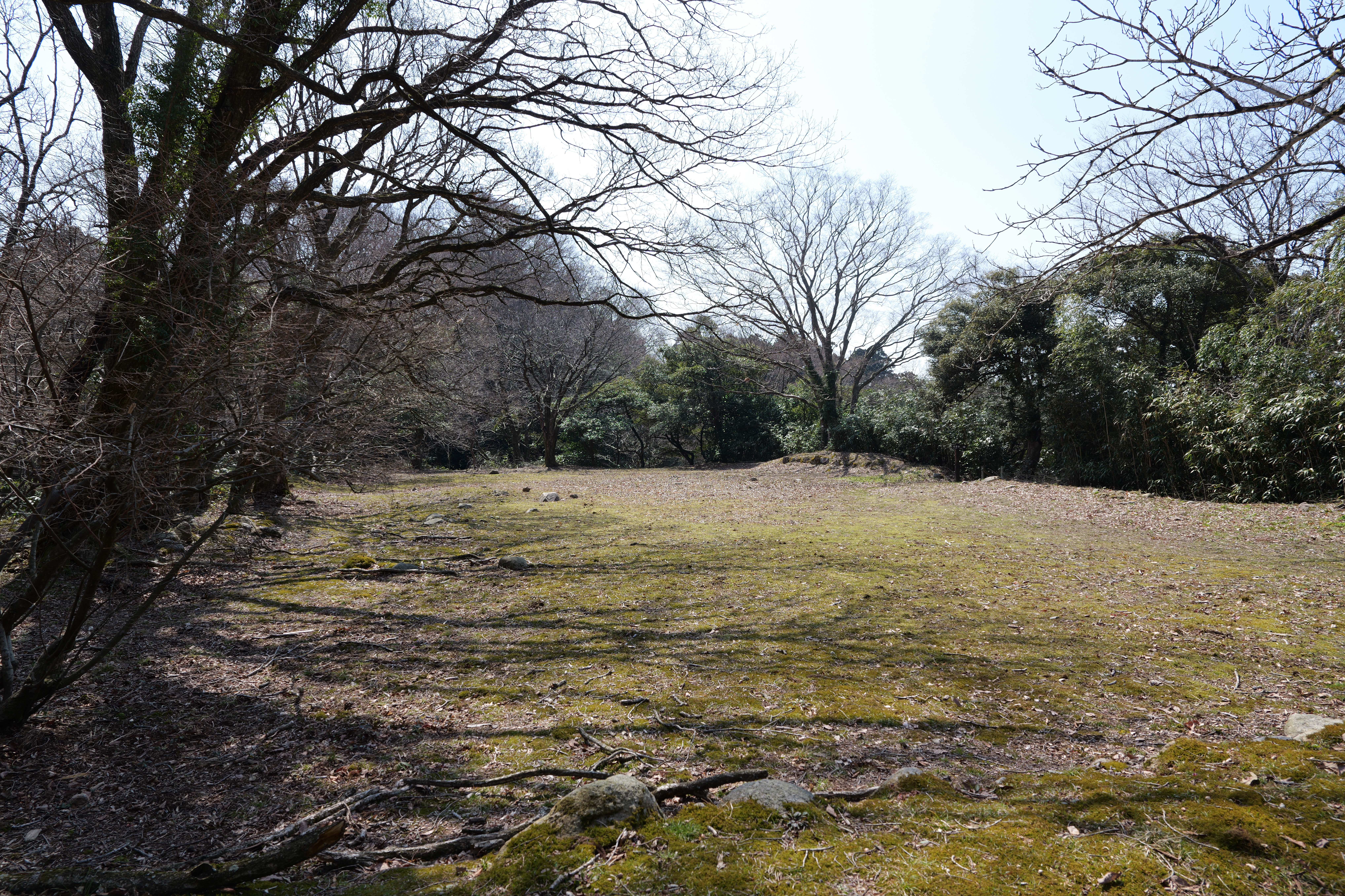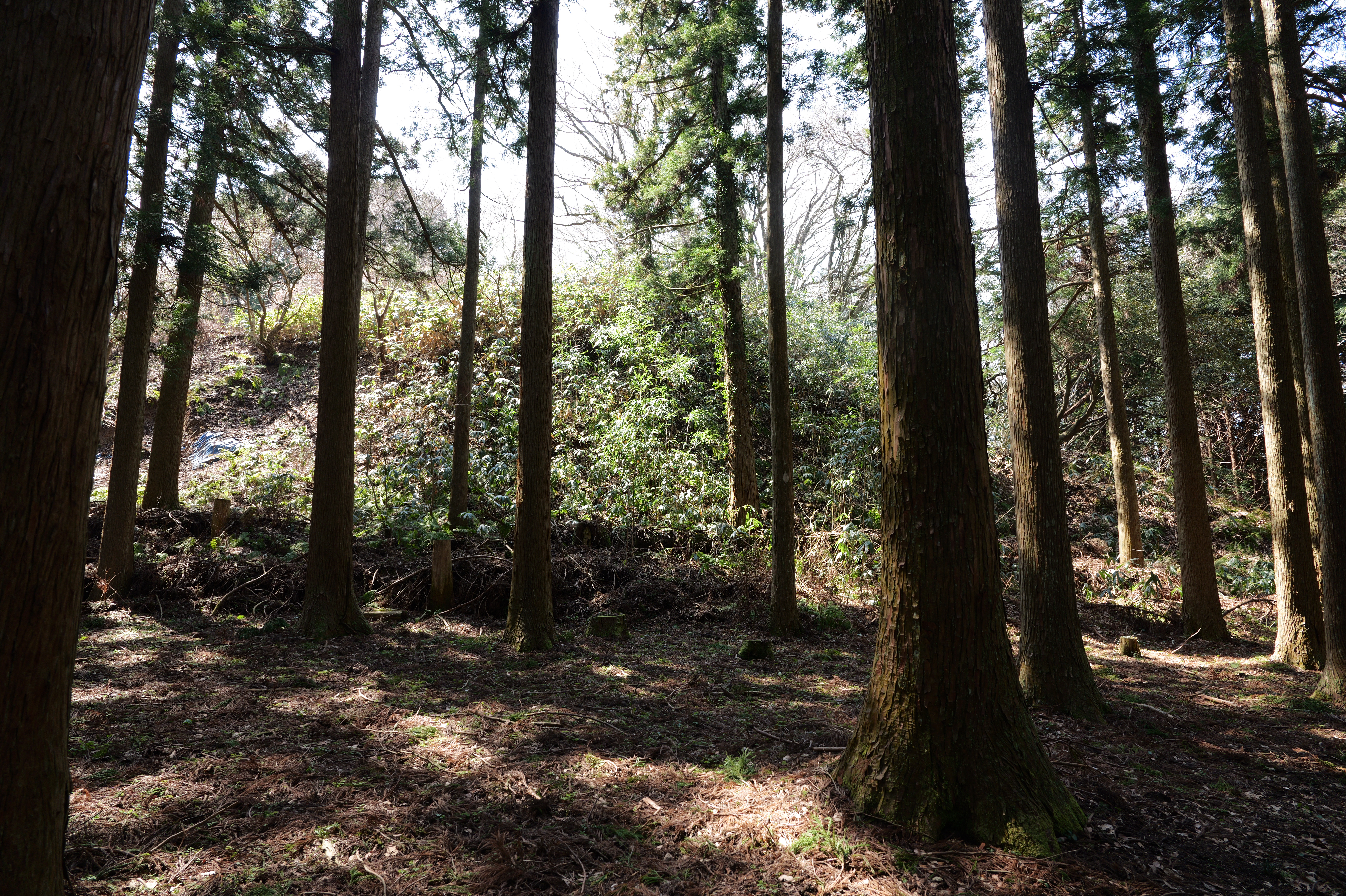 大堀切から坂を登ると三の丸です。三の丸は曲輪の中で最大規模です。三の丸の南端に行くと大堀切を上からのぞくことができますが、本当に高くてすごいです。