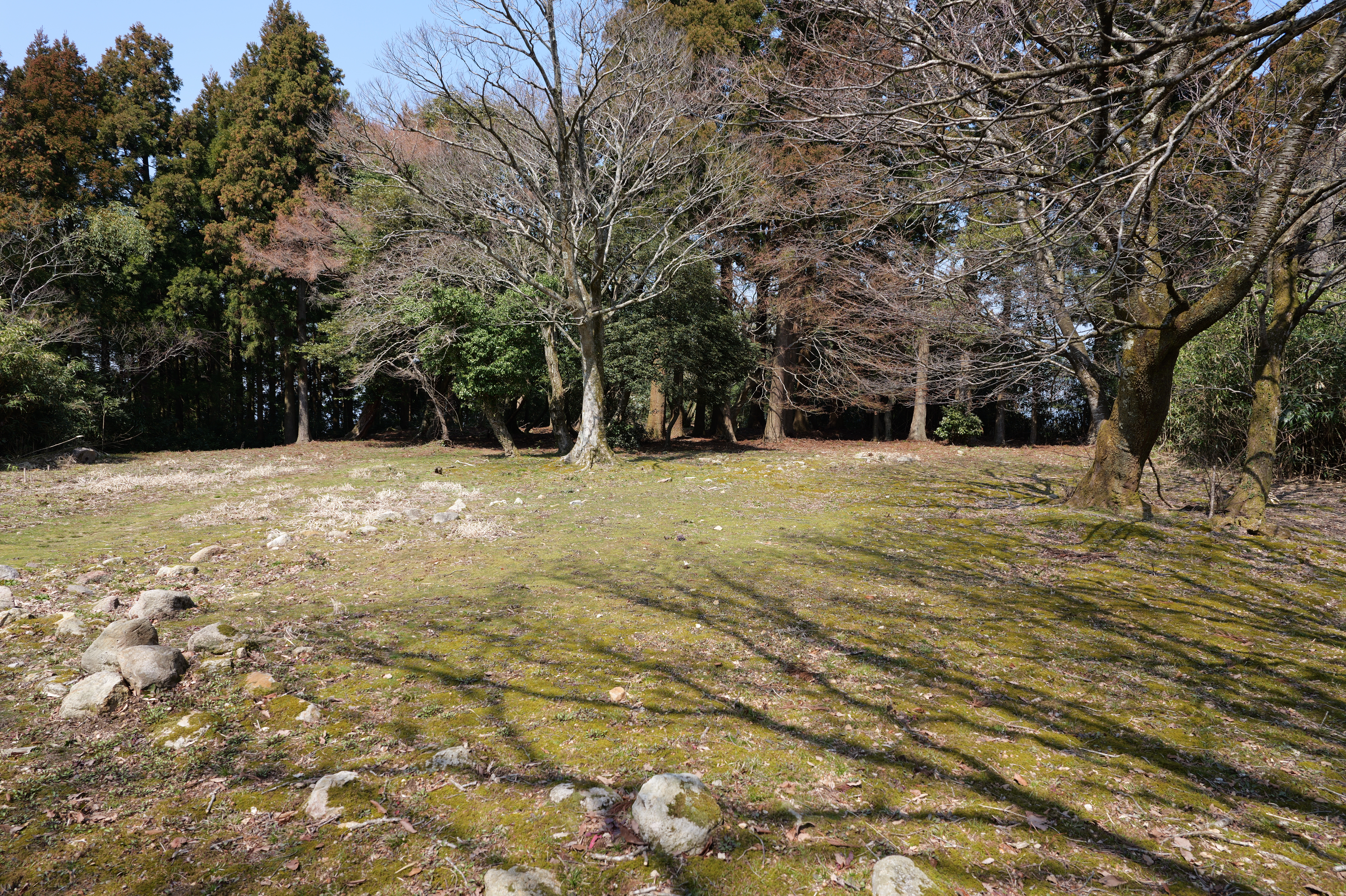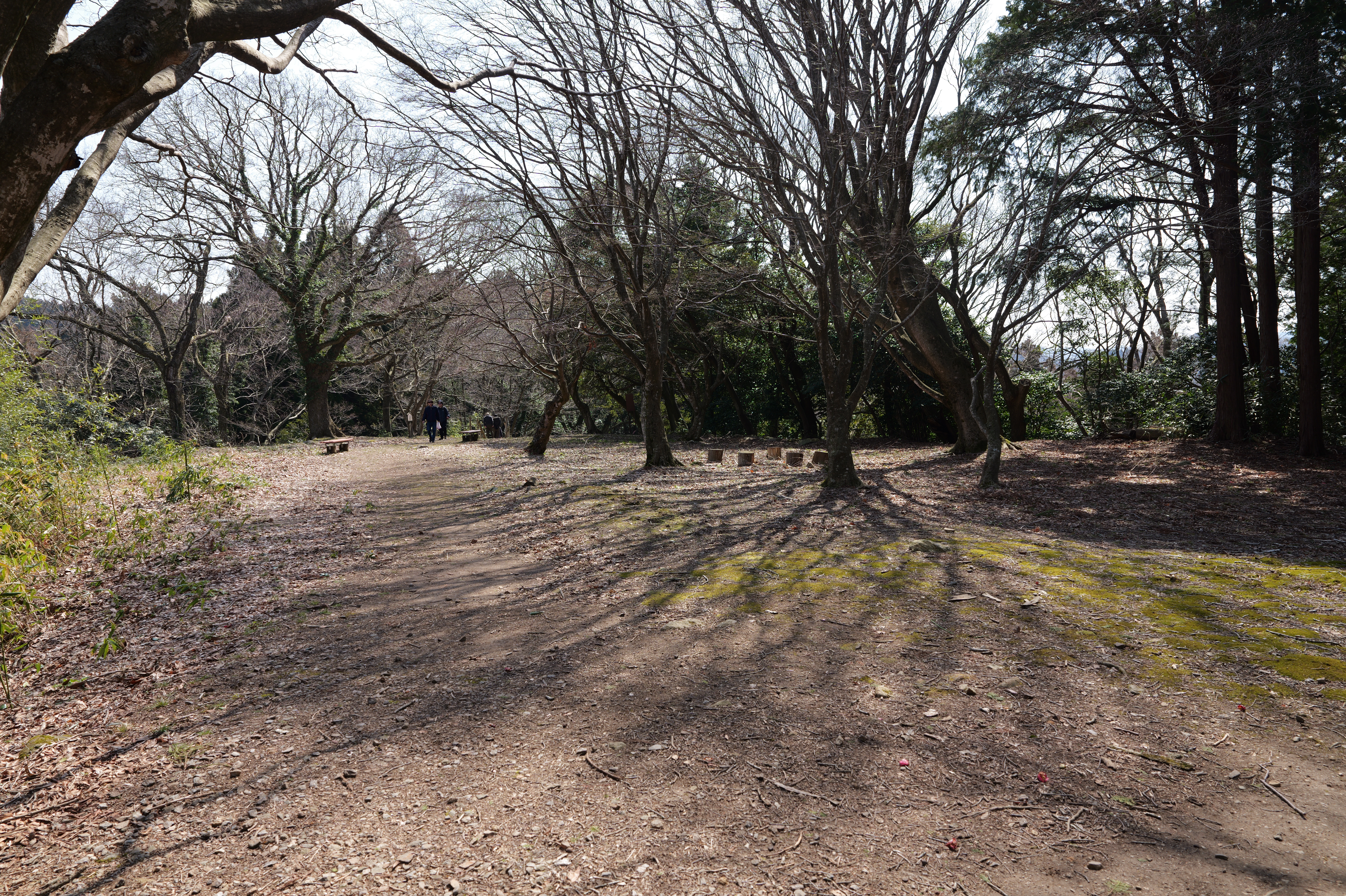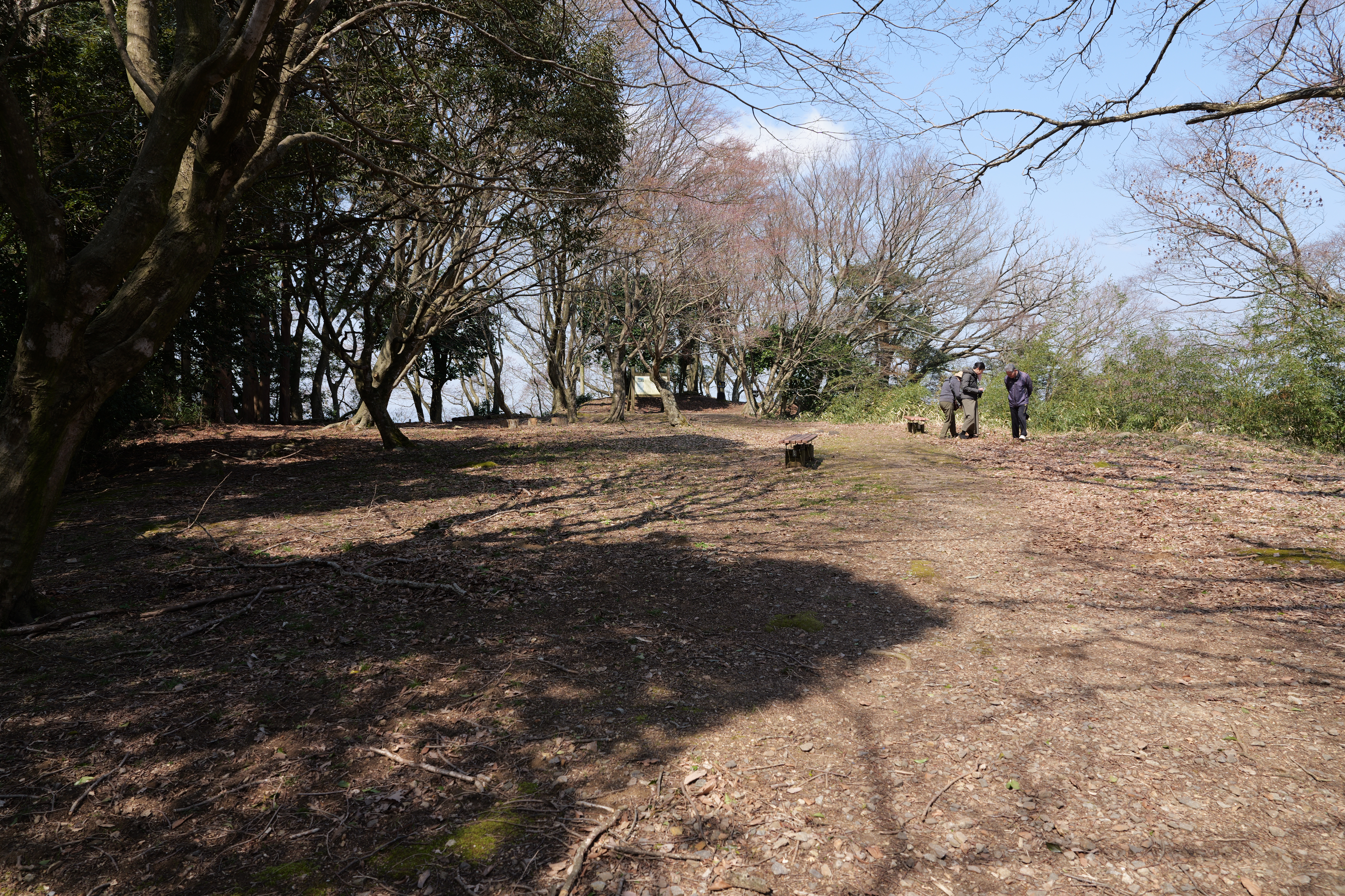 今回山頂からは番所跡まで散策するつもりなので、旧大手道を少し下りると右側に番所跡がありました。入口らしき場所は分からず土塁を登ると曲輪が広がっていました。番所は畠山氏の津陽門で城内臣下の出入口を警護の兵士が交代で詰めていたところです。これで山頂部の散策は終了、本丸駐車場へ戻りました。2時間位の散策でした。