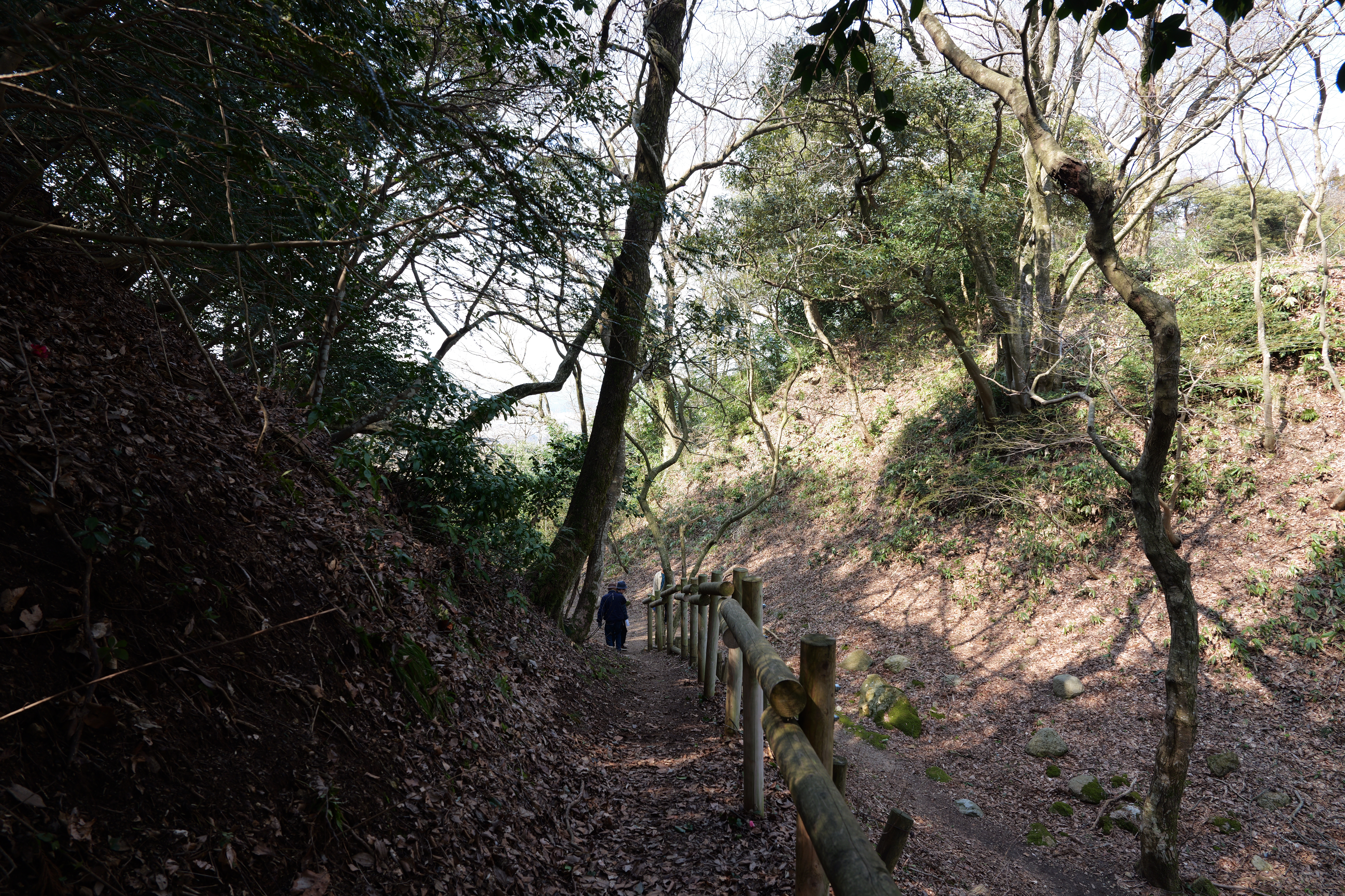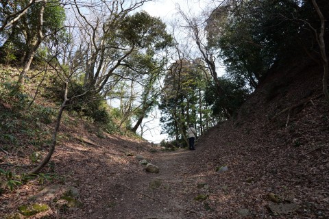 本丸へ向かう登城路入口付近には本丸と長屋敷の間の大堀切があります。長屋敷には立ち入れないので登城路を進みます。