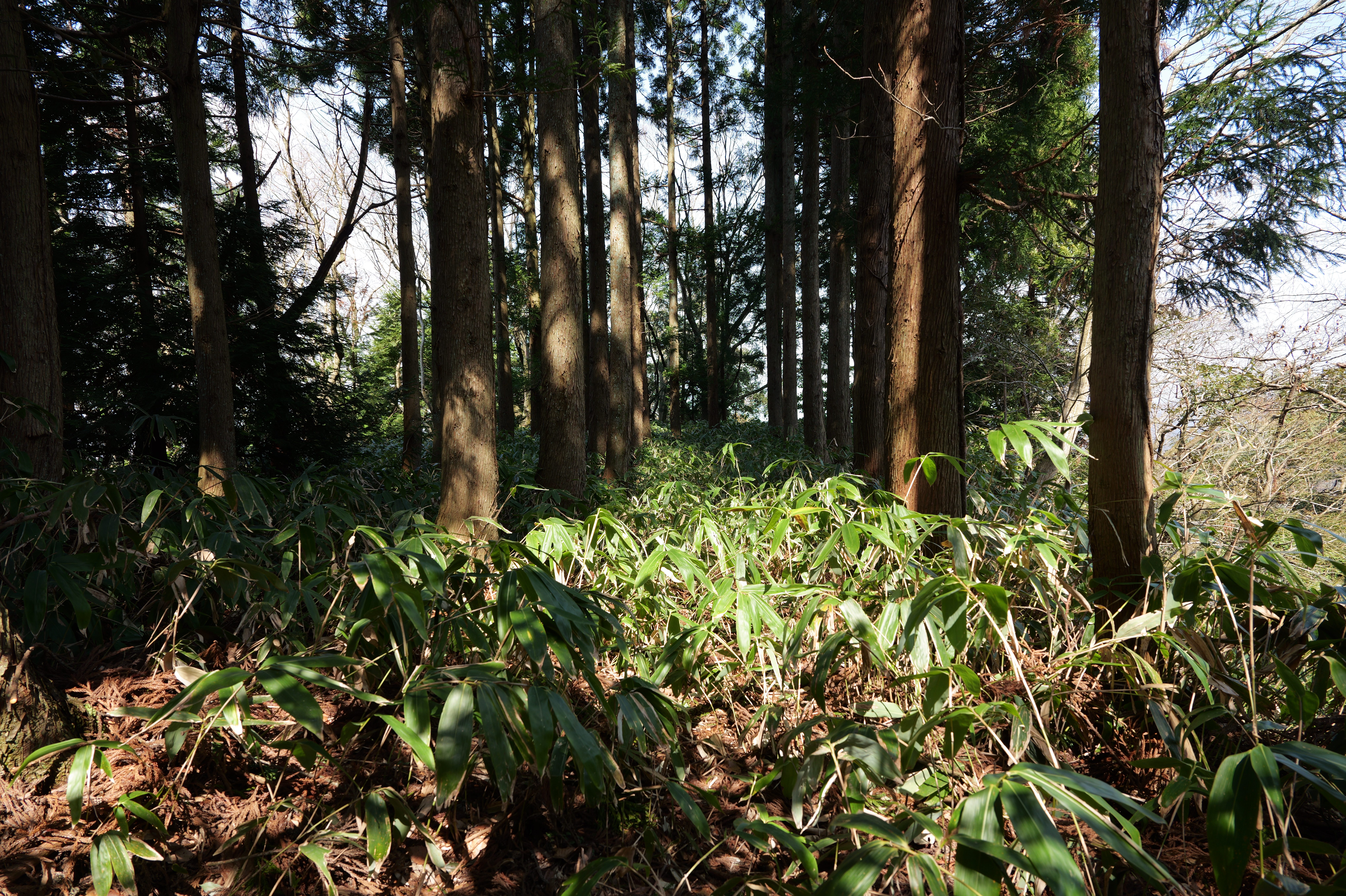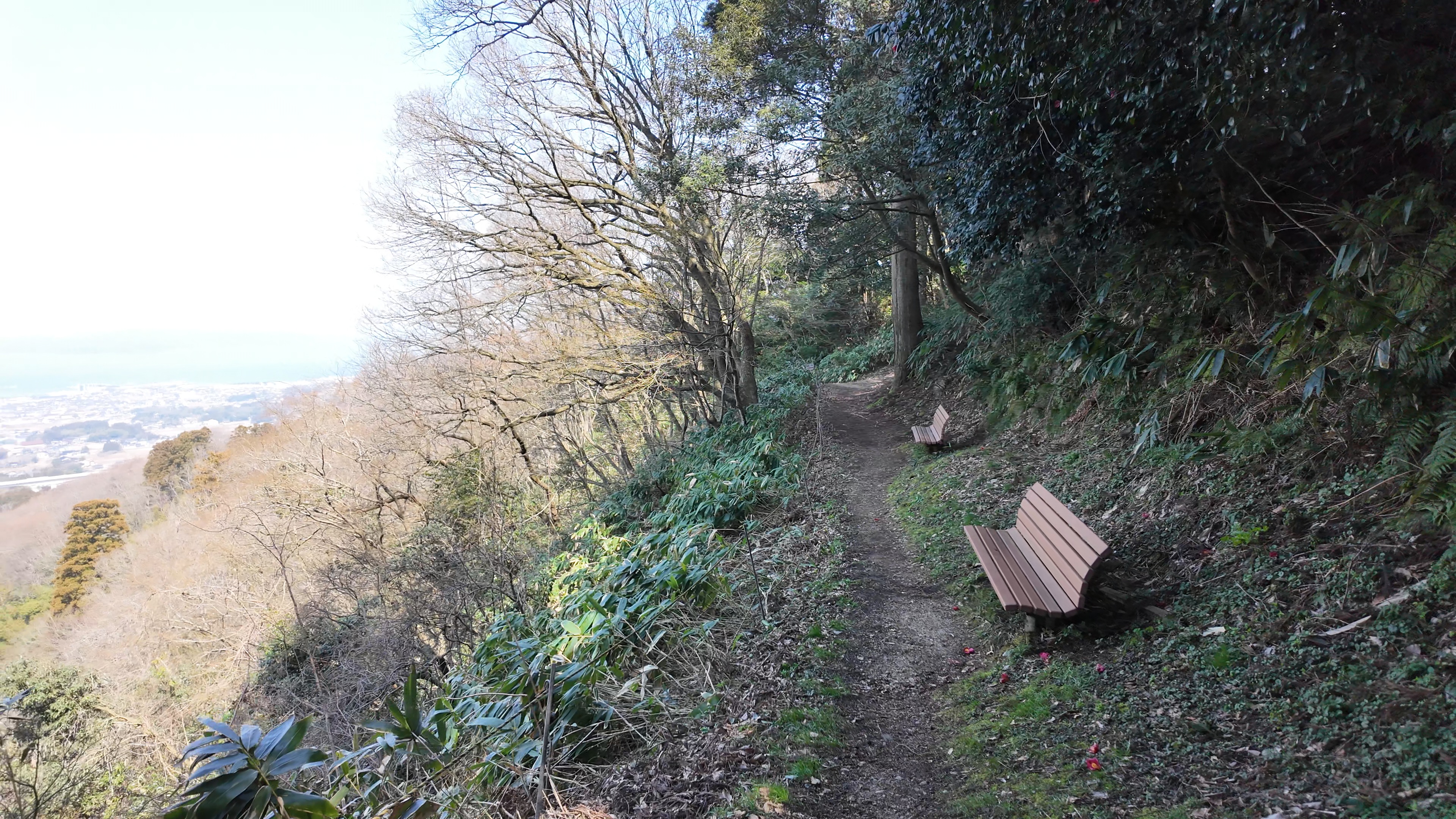 安寧寺跡から伸びる袴腰下の道は旧大手道に至りますが、ここからの眺望も素晴らしいです。ただ、本丸や本丸駐車場からの眺望と同じ方向なんですよね。旧大手道に出たら右に少し行った左側に沓掛、袴腰北側にあります。 ここで身なりを整えたそうですが藪化していました。