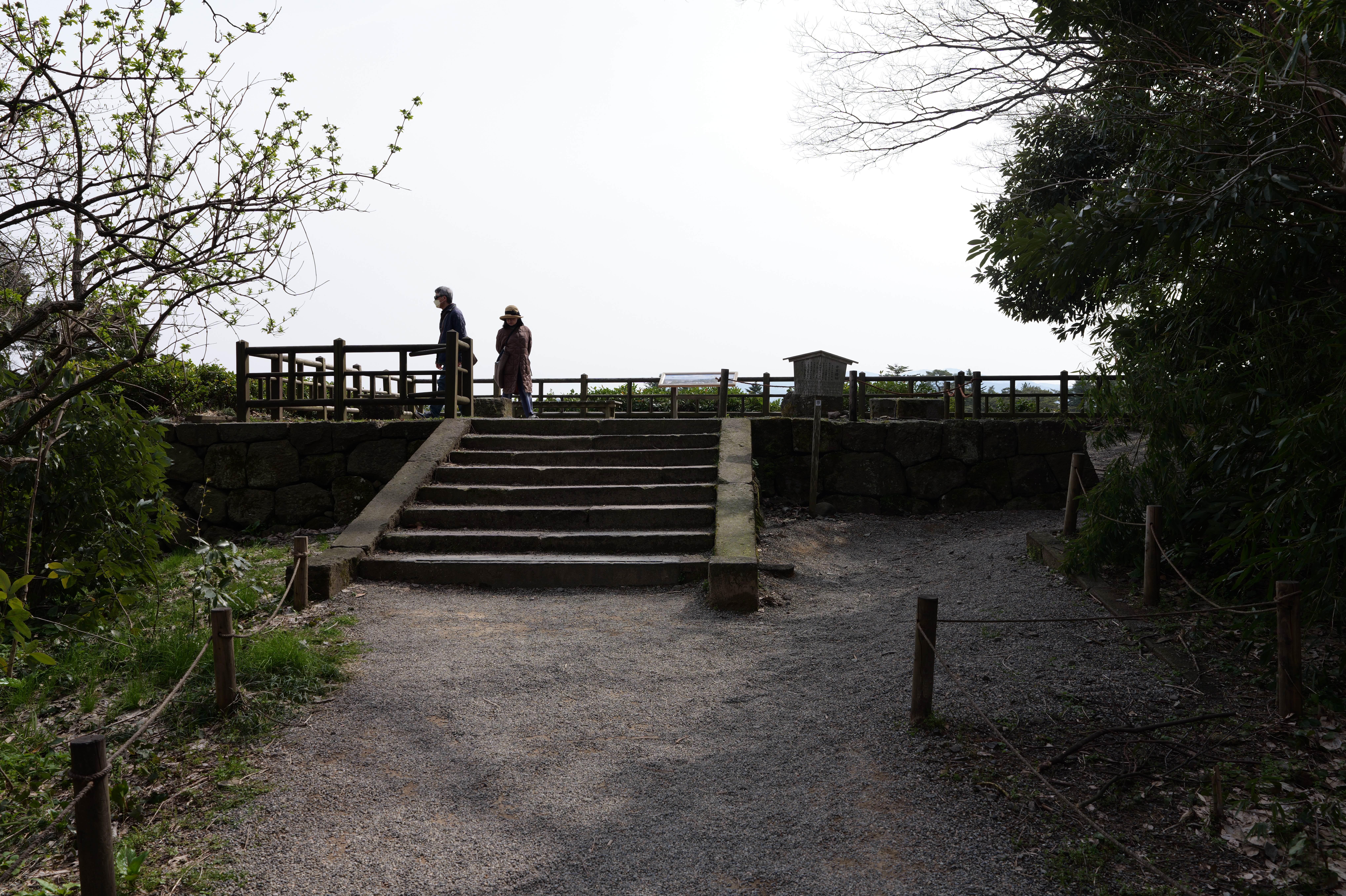 本丸附段の東側から鉄門跡をすぎると本丸で、入ってすぐ左側に戌亥櫓跡があります。その東側には大きな空堀があり、旧陸軍により明治から大正期に作られた旧陸軍弾薬庫隧道が見えます。この場所はもともと本丸なのであとからつくられたものですね。