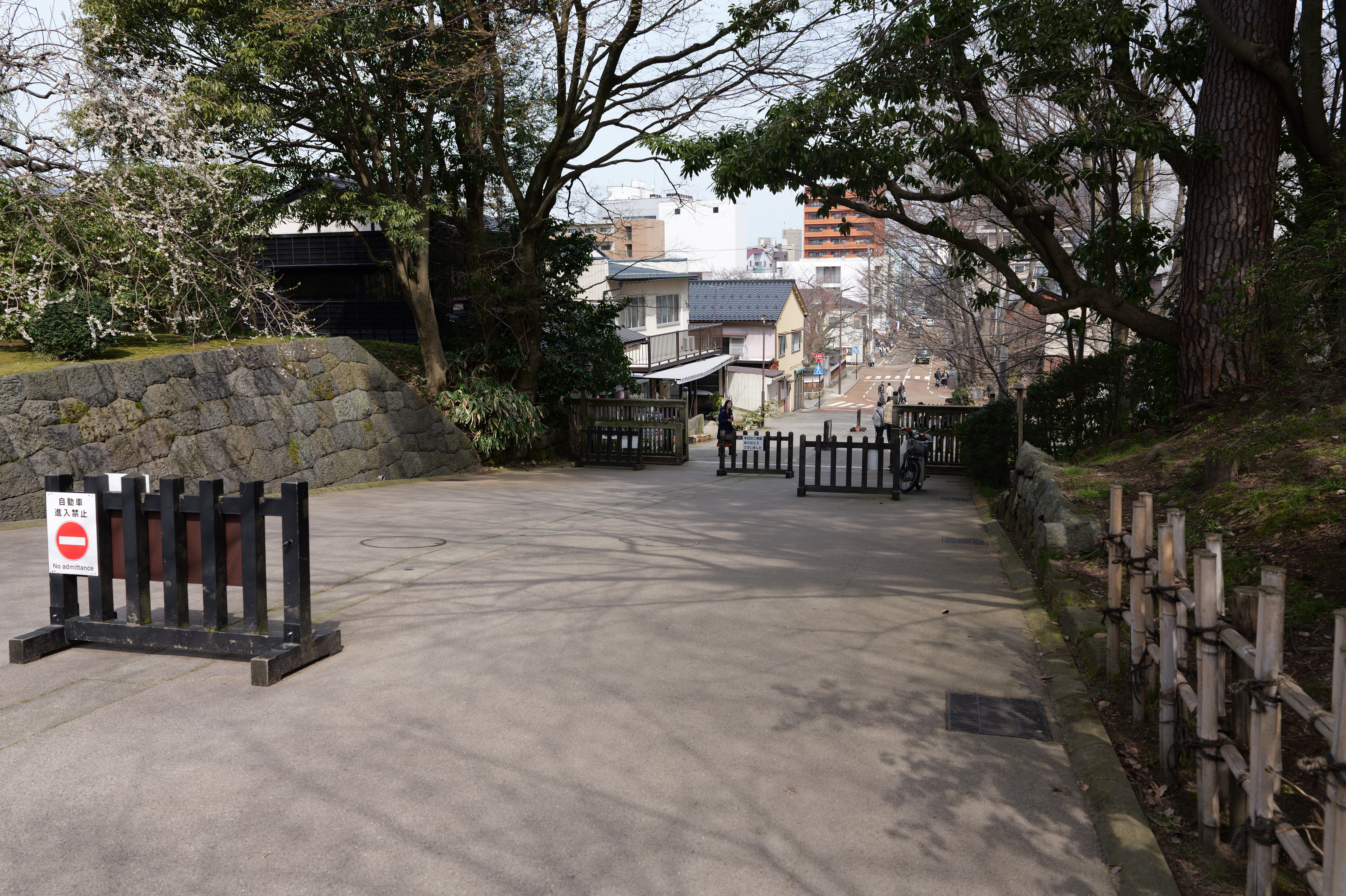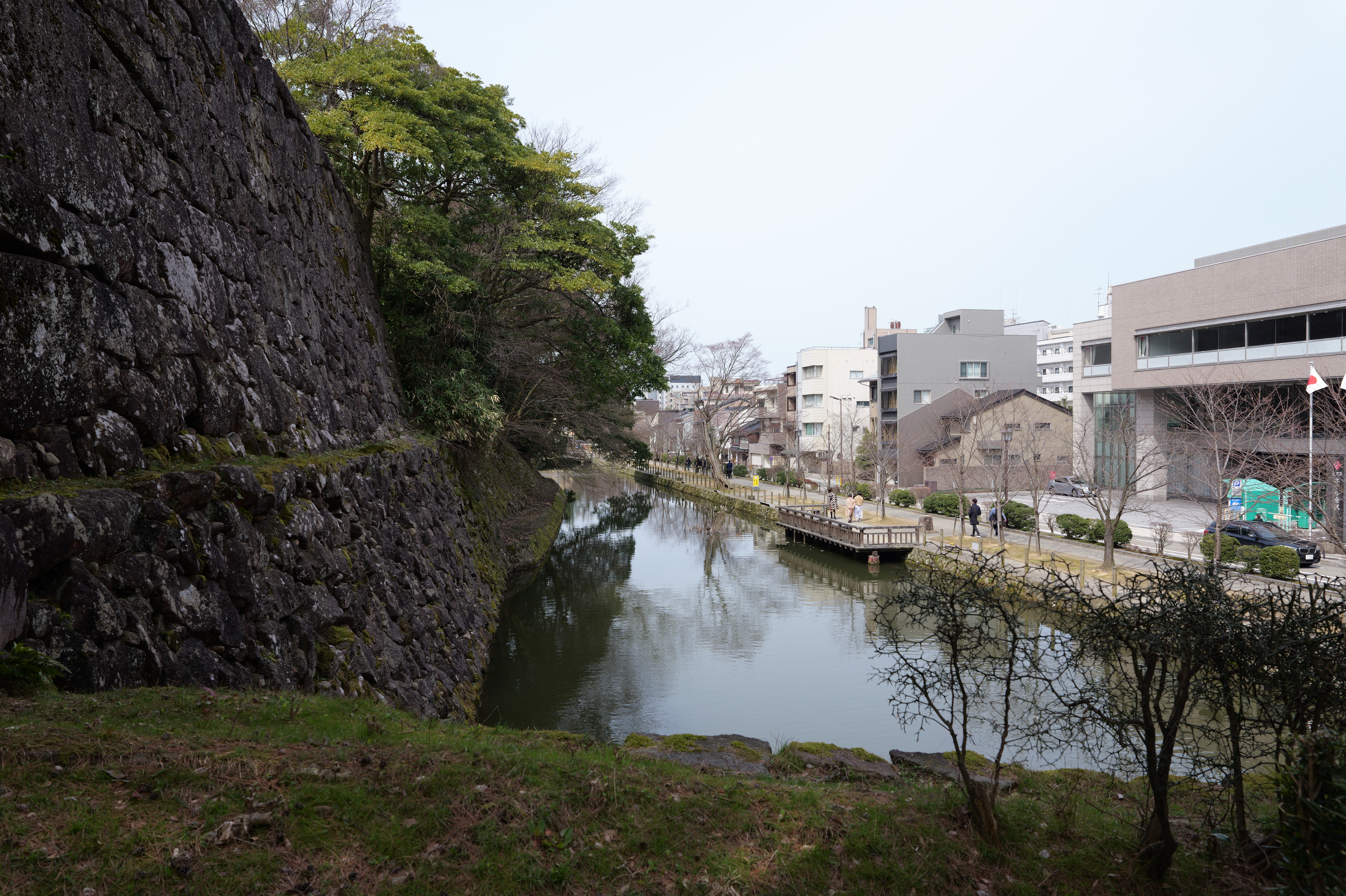 大手堀に沿って歩いていくと黒門跡で、金沢御堂、佐久間時代の大手です。ここから再度新丸に入ります。湿生園の護岸は往時の新丸南堀の外郭を再現しています。
